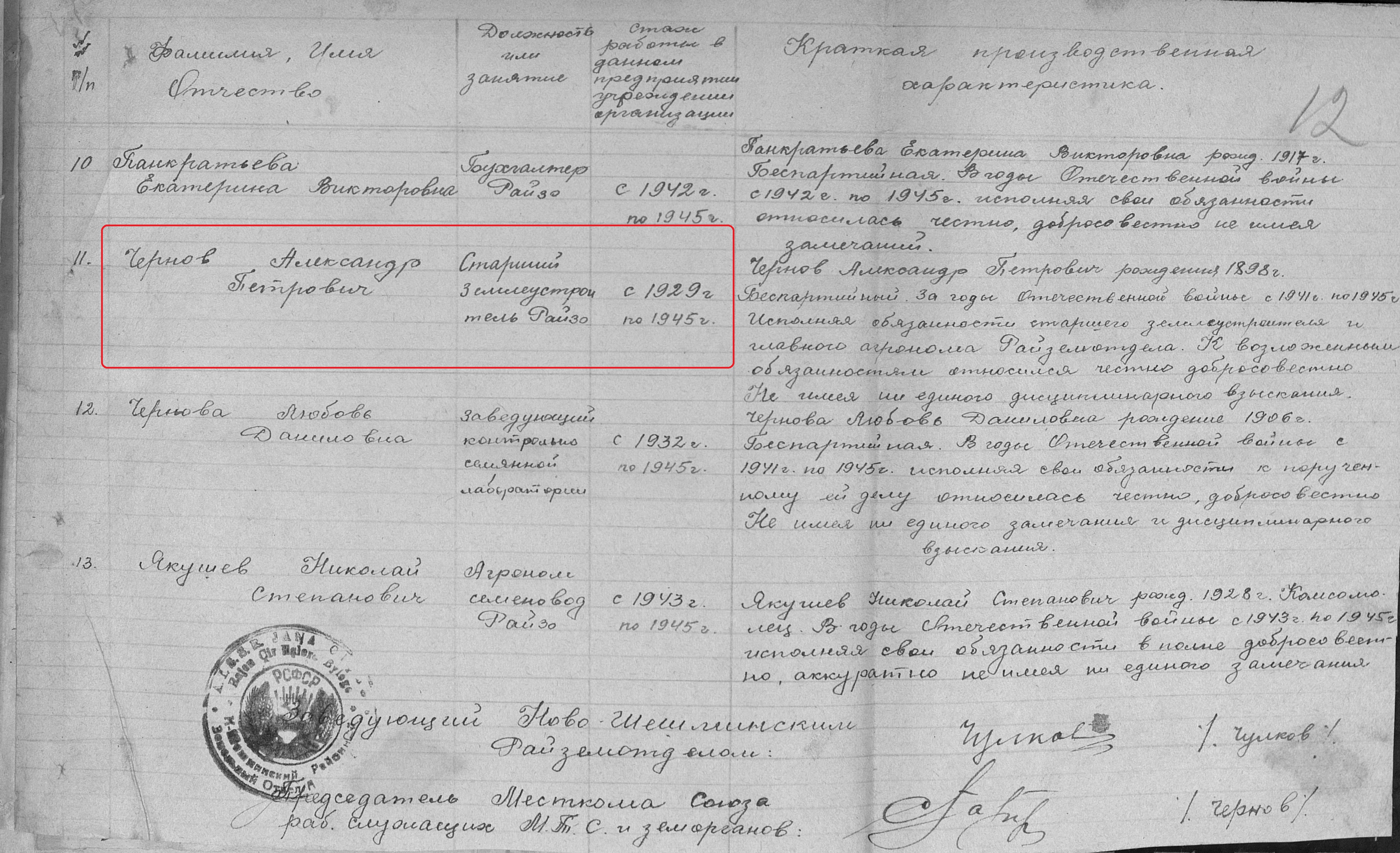 Чернов Александр Петрович родился в 1898 году. Место жительства: с.Новошешминск Ново-Шешминский район ТАССР. В годы Великой Отечественной войны работал в Районном Земельном отделе по Новошешминскому району старшим землеустроителем. Награжден медалью "За доблестный труд в Великой Отечественной войне 1941–1945 гг." (Акт от 01.1946 г., фонд 3610, опись 2, дело № 174, лист 12). Выбыл.