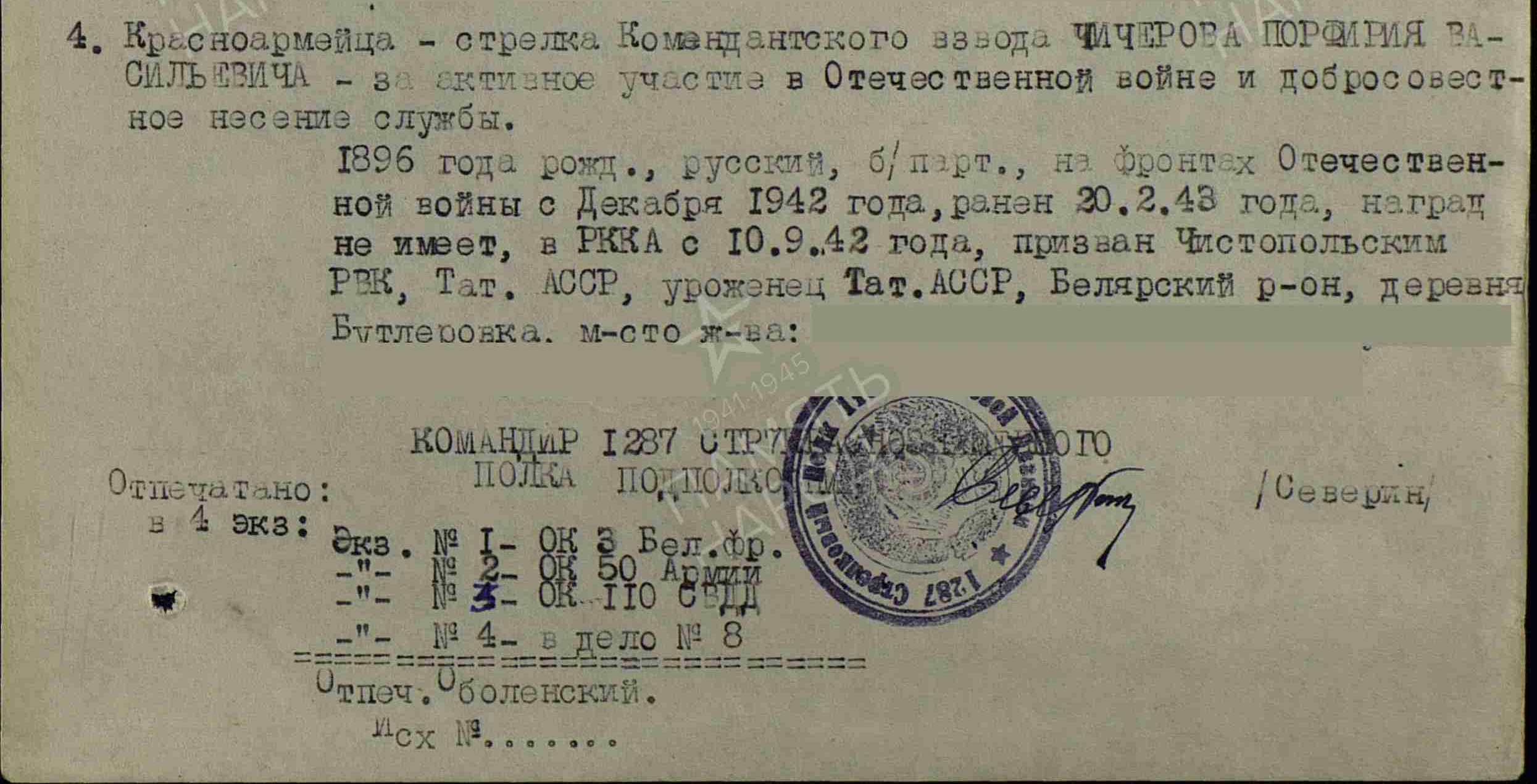 ЧИЧИРОВ (ЧИЧЕРОВ) Порфирий Васильевич, 1896, д. Бутлеровка (имение). Участник Гражданской войны с 1918 в боях против армии Колчака. Жил в г. Чистополь. До 1942 трудился по брони на оборонных работах. Мобилизован Чистопольским РВК 9 сент. 1942. В боях с дек. 1942. Красноармеец, 156 УР Сталинградского фронта/ 62 А Донского фронта. Ранен 20 фев. 1942. После излечения — стрелок комендантского взвода охраны штаба 1287 СП 110 СД 61 А/ 50 А Брянского/ Белорусского/ 1, 2 и 3 Белорусского фронта. Награждён двумя медалями «За боевые заслуги» (1944, 1945).