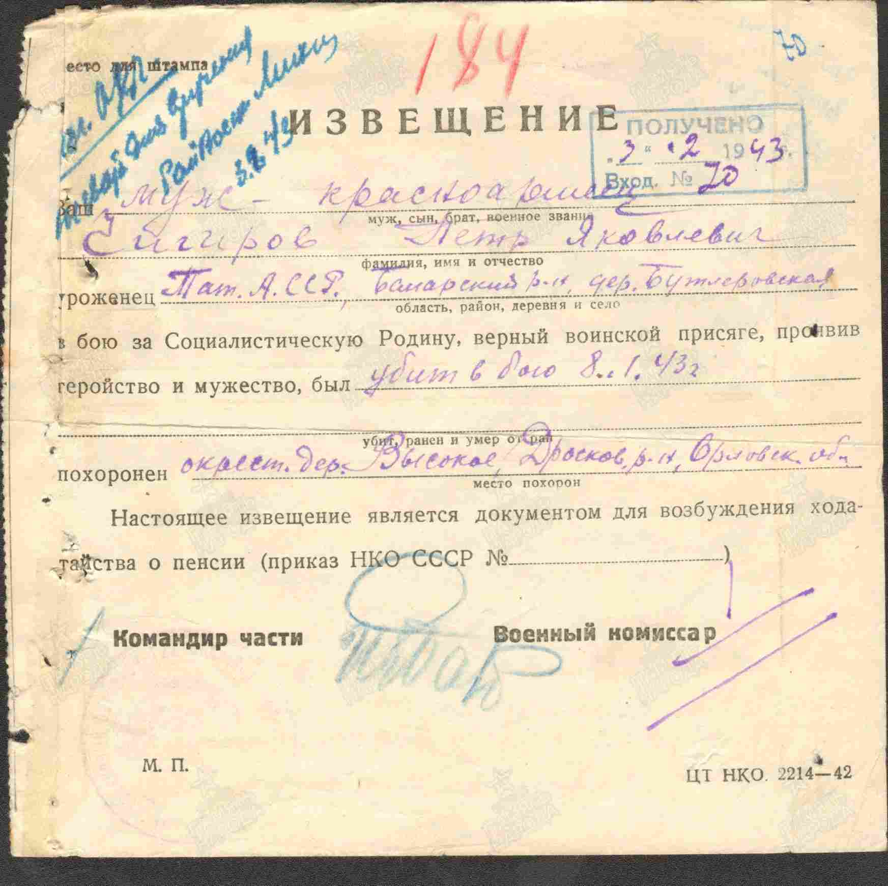 ЧИЧИРОВ Пётр Яковлевич, 1908, д. Бутлеровка. Мобилизован 27 авг. 1941 Билярским РВК. Красноармеец, 73 СД 48 А Брянского фронта. Погиб 8 янв. 1943, с. Высокое, Думиничский р-н, Калужская обл.