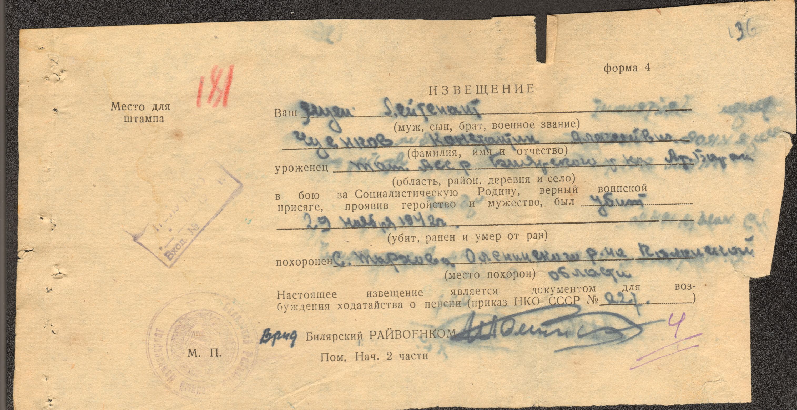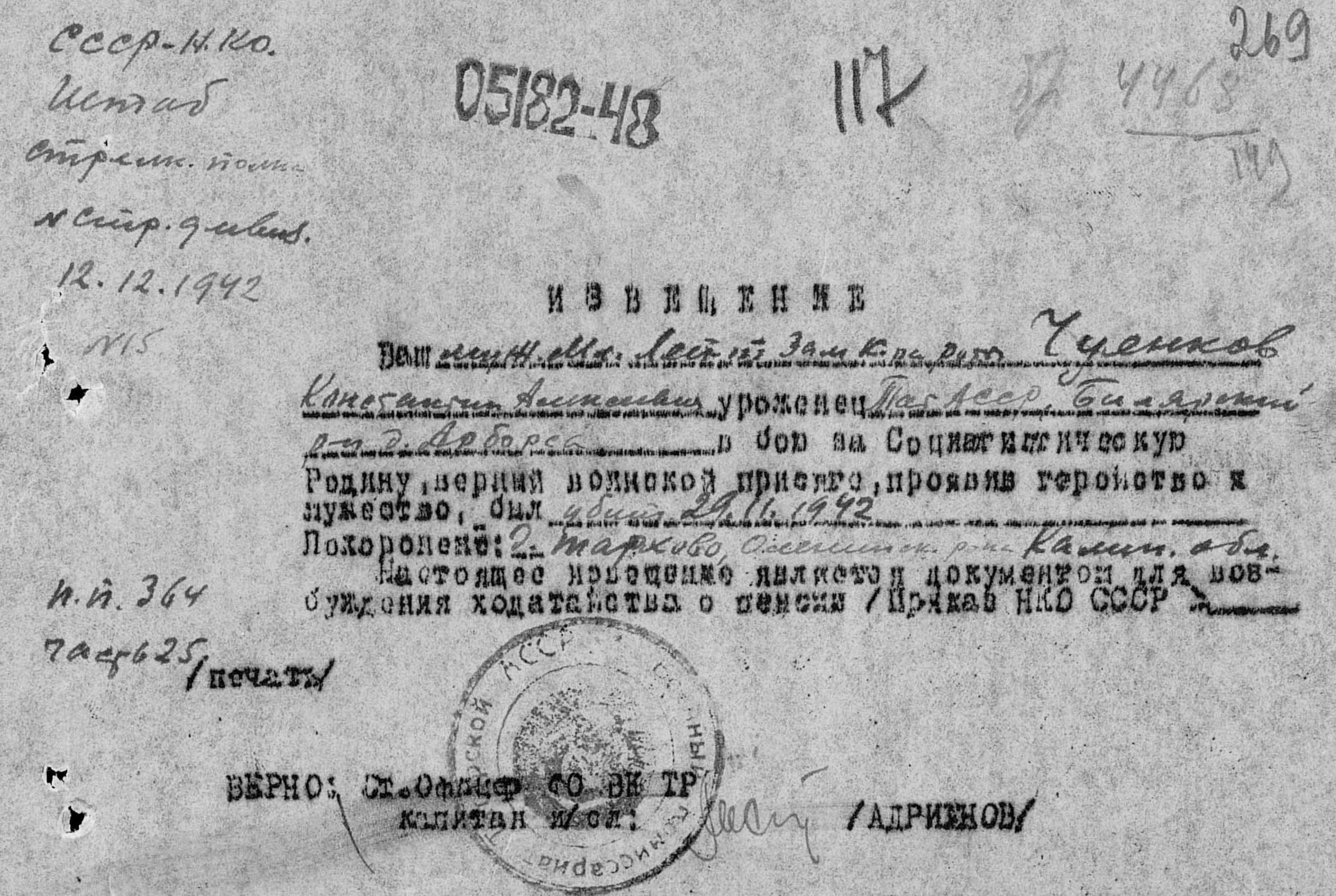ЧУЕНКОВ Константин Алексеевич, 1904, с. Арбузов Баран. Мобилизован Билярским РВК. Мл. лейтенант, заместитель ком. роты 1319 СП, 185 СД. Погиб 29.11.1942. Похороронен - Калининская (Тверская) обл., Оленинский р-н, д. Тархово.
