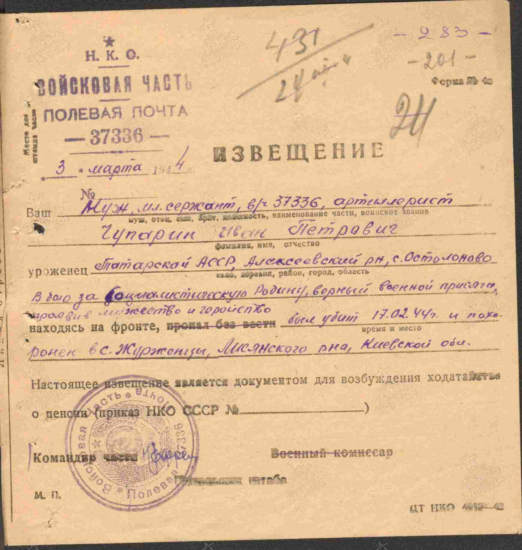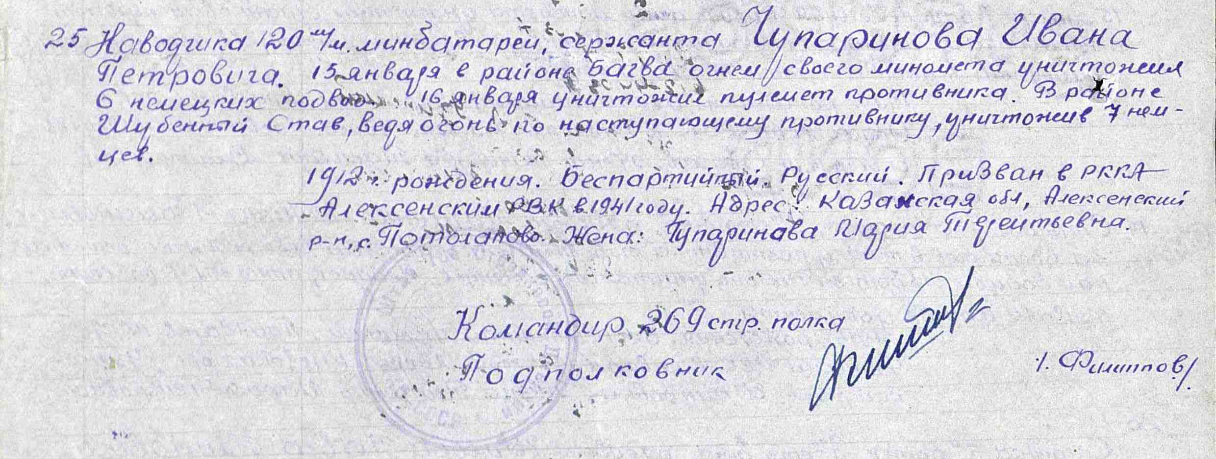 ЧУПАРИНОВ Иван Петрович, 1912, с. Остолопово. Мобилизован Алексеевским РВК в 1941. В 1944 – сержант, наводчик 120 мм миномёта, 269 СП 136 СД 27 А 1 Украинского фронта. Награждён медалью «За отвагу». Погиб 17 фев. 1944, с. Журжинцы, Лысянский р-н, Черкасская обл., УкрССР.
