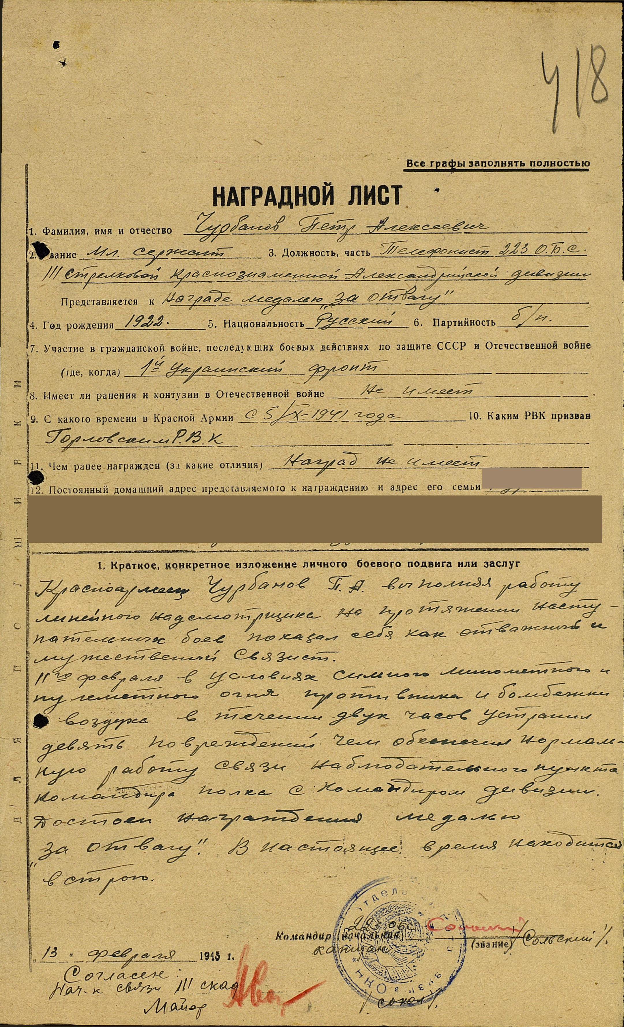 ЧУРБАНОВ Пётр Алексеевич, 1922, с. Чистопольские Выселки. Мобилизован в Красную Армию Горловским РВК Сталинской (Донецкой) обл. в 1941 г. Принимал участие в боях за Сталинград. Ранен в декабре 1942 г. Далее воевал связистом (телефонистом), линейным надсмотрщиком в 223 отд. батальоне связи 111 стр. Александрийской Краснознамённой ордена Богдана Хмельницкого дивизии, мл. сержант. Принимал участие в боях на Воронежском фронте (прорыв немецкой обороны в р-не среднего течения Дона, бои под Харьковом - март 1943г., Курская битва - июль 1943г., Белгородско-Харьковская наступательная операция - август 1943г.), 1 Укр. Ф (освобождение Западной Украины, Ясско-Кишенёвская операция, Румыния, освобождение Польши, Пражская операция). Награждён медалью "За отвагу" (февраль 1945г.), орденом Отечественной войны 2 ст. (1985г.), медалями "За победу над Германией", "За трудовую доблесть", "Ветеран труда". После войны жил и работал в с. Алексеевское, заместитель директора фабрики художественного ткачества по снабжению. Скончался в 2001 г., похоронен в с. Алексеевское.