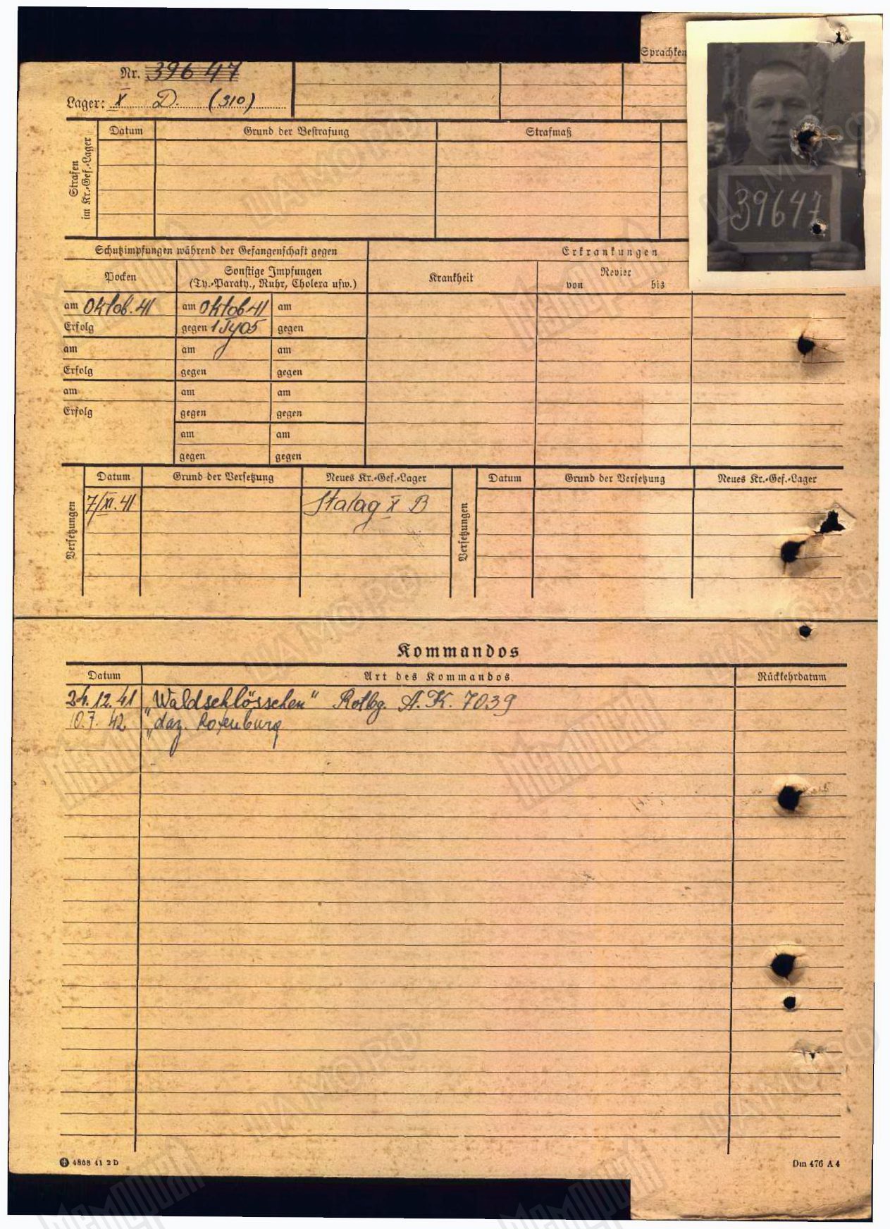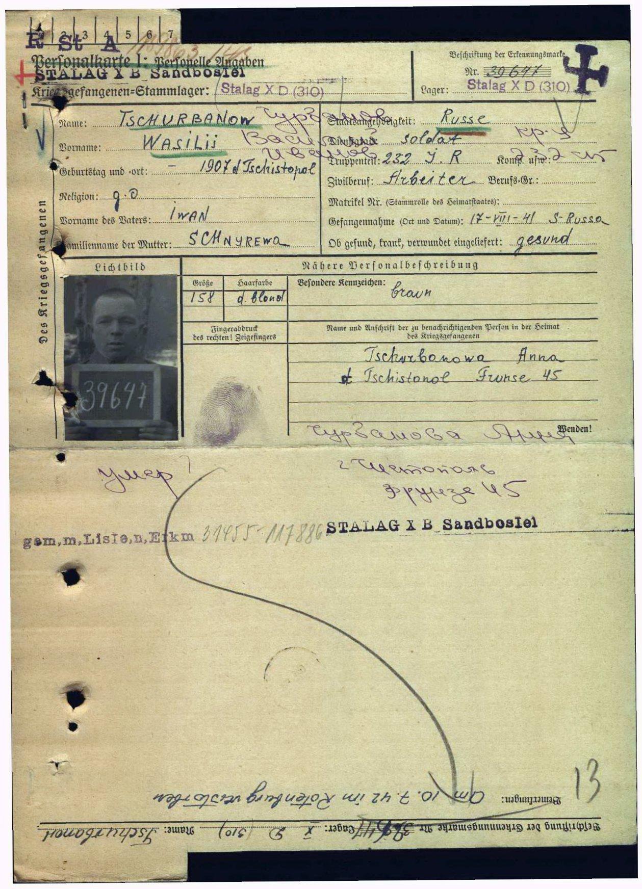 Родился в 1907 г. в с. Чистопольские Выселки Чистопольского уезда Казанской губернии. Призван 14 июля 1941 г. Чистопольским РВК. Пленен 17 августа 1941 г. под Старой Руссой. Содержался в шталаге X D (310). Лагерный номер 39647. Красноармеец погиб в плену 10 июля 1942 г.