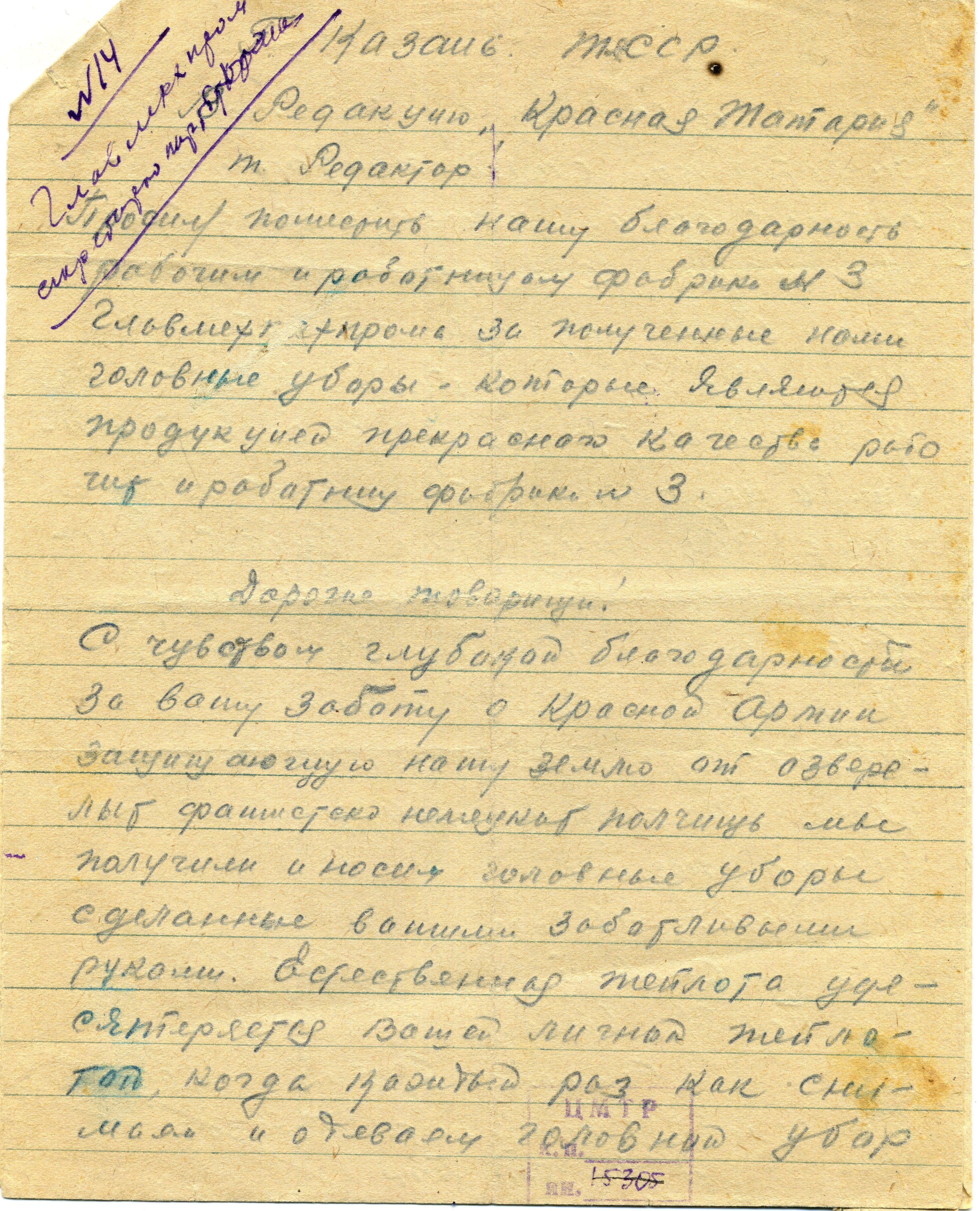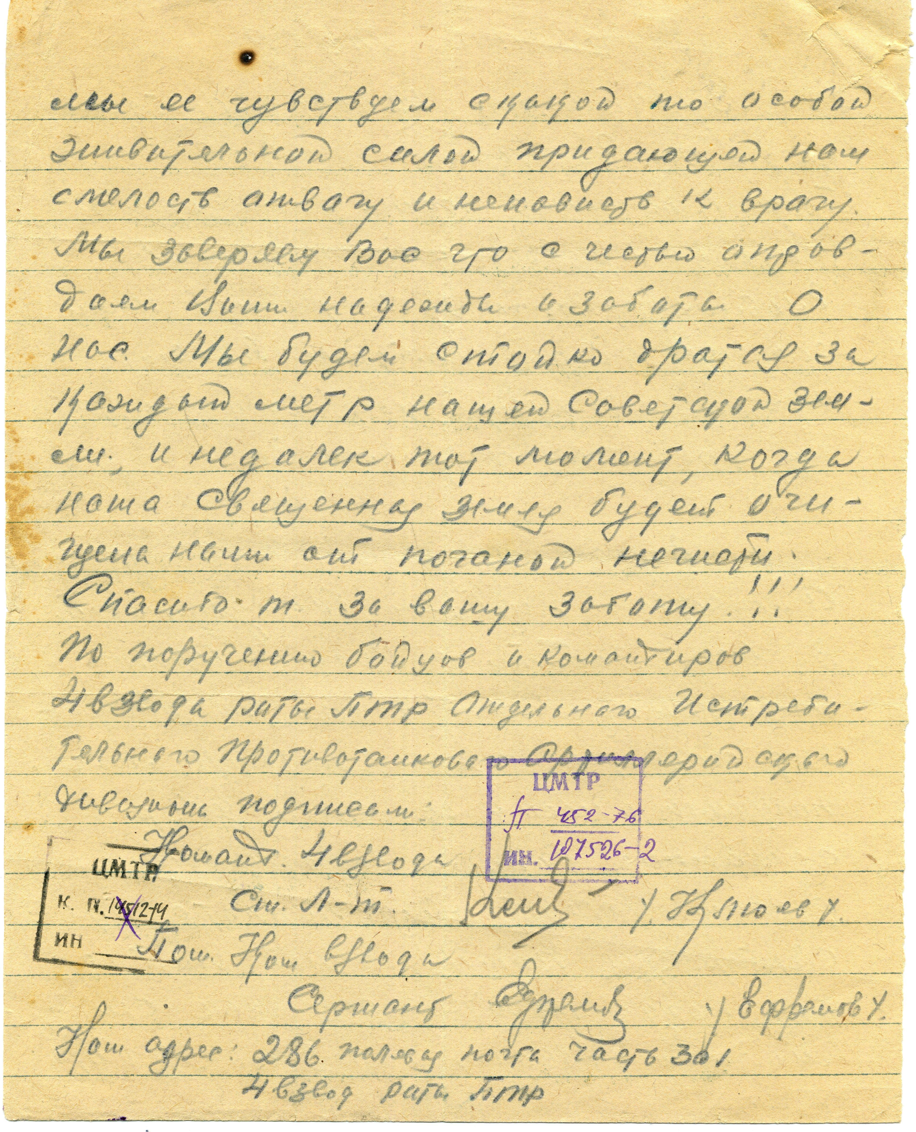 С чувством глубокой благодарности за вашу заботу о Красной Армии защищающую нашу землю от озверелых фашистко немецких полчищь мы получили и носим головные уборы сделанные вашими заботливыми руками. Естественная теплота удесятеряется Вашей личной теплотой, когда каждый раз как снимаем и одеваем головной убор мы ее чувствуем с какой то особой живительной силой придающей нам смелость отвагу и ненависть к врагу. Мы заверяем Вас что с честью опровдаем Ваши надежды и заботы о нас. Мы будем стойко драться за каждый метр нашей Советской земли, и недалек тот момент, когда наша Священная земля будет очищена нами от поганой нечисти