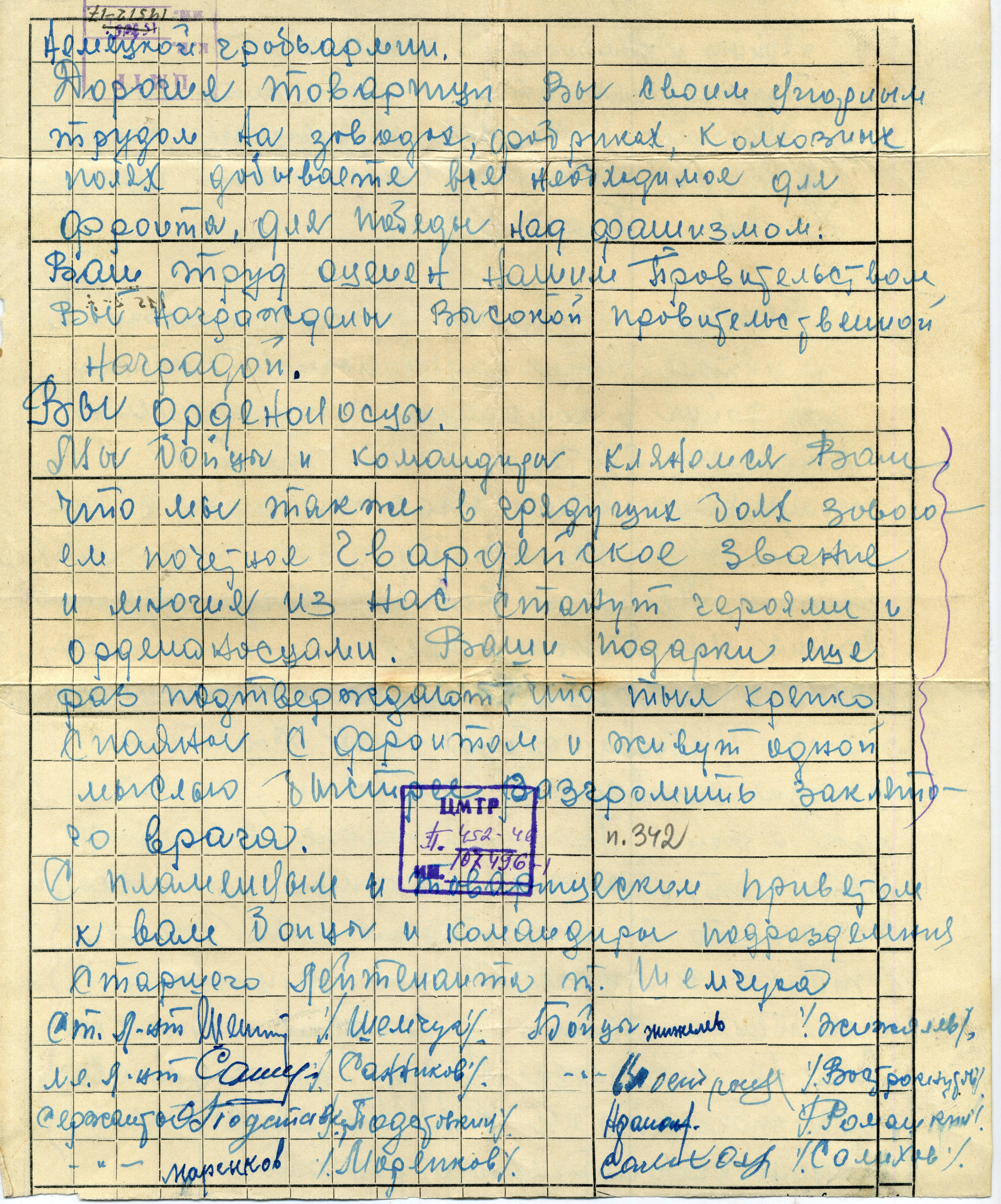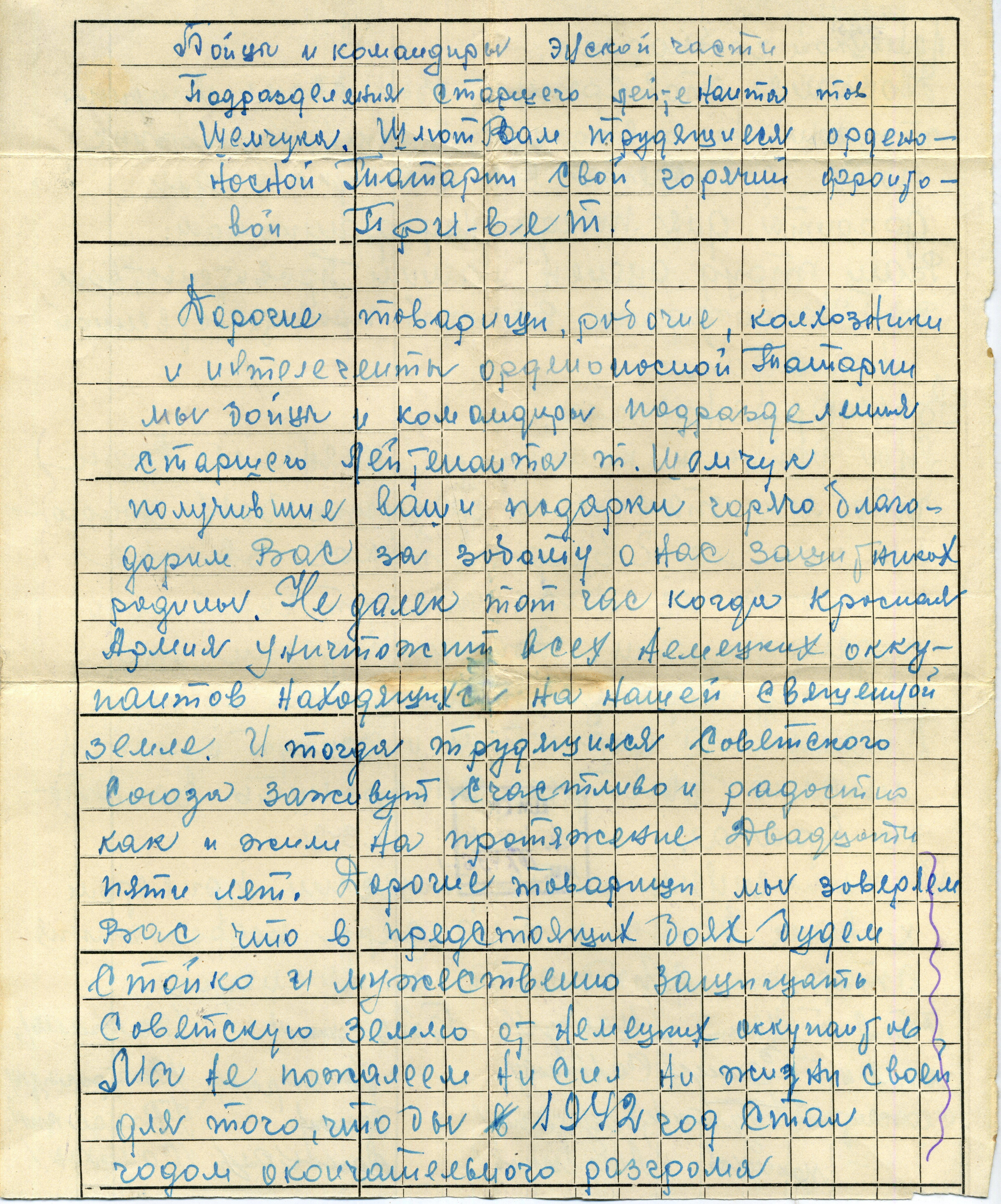 Дорогие товарищи, рабочие, колхозники и интеллигенты орденоносной Татарии мы бойцы и командиры подразделения старшего лейтенанта т.Темчук получившие ваши подарки горячо благодарим Вас за заботу о нас защитниках родины. Не далек тот час когда Красная Армия уничтожит всех немецких оккупантов находящихся на нашей священной земле. И тогда трудящиеся Советского Союза заживут счастливо и радостно как и жили на протяжение двадцати пяти и лет. Дорогие товарищи мы заверяем Вас что в предстоящих боях будем стойко и мужественно защищать Советскую землю от немецких оккупантов. Мы не пожалеем ни сил ни жизни своей для того, что бы 1942 год стал годом окончательного разгрома немецкой гробьармии.