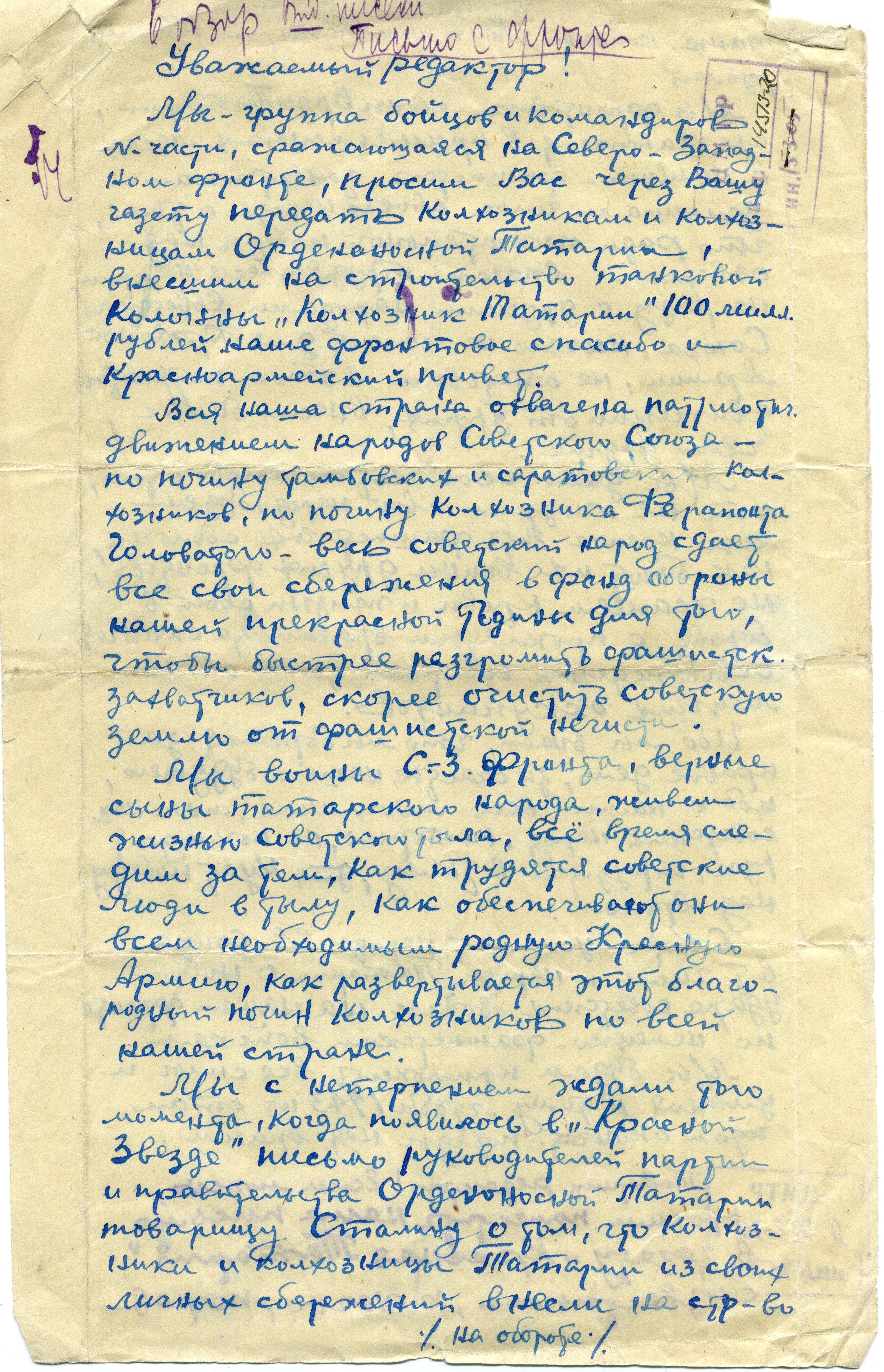Мы - группа бойцов и командиров № части, сражающаяся на Северо-Западном фронте, просим Вас через Вашу газету передать колхозникам и колхозницам Орденоносной Татарии, внесшим на строительство танковой колонны «Колхозник Татарии» 100 милл. рублей наше фронтовое спасибо и красноармейский привет.
