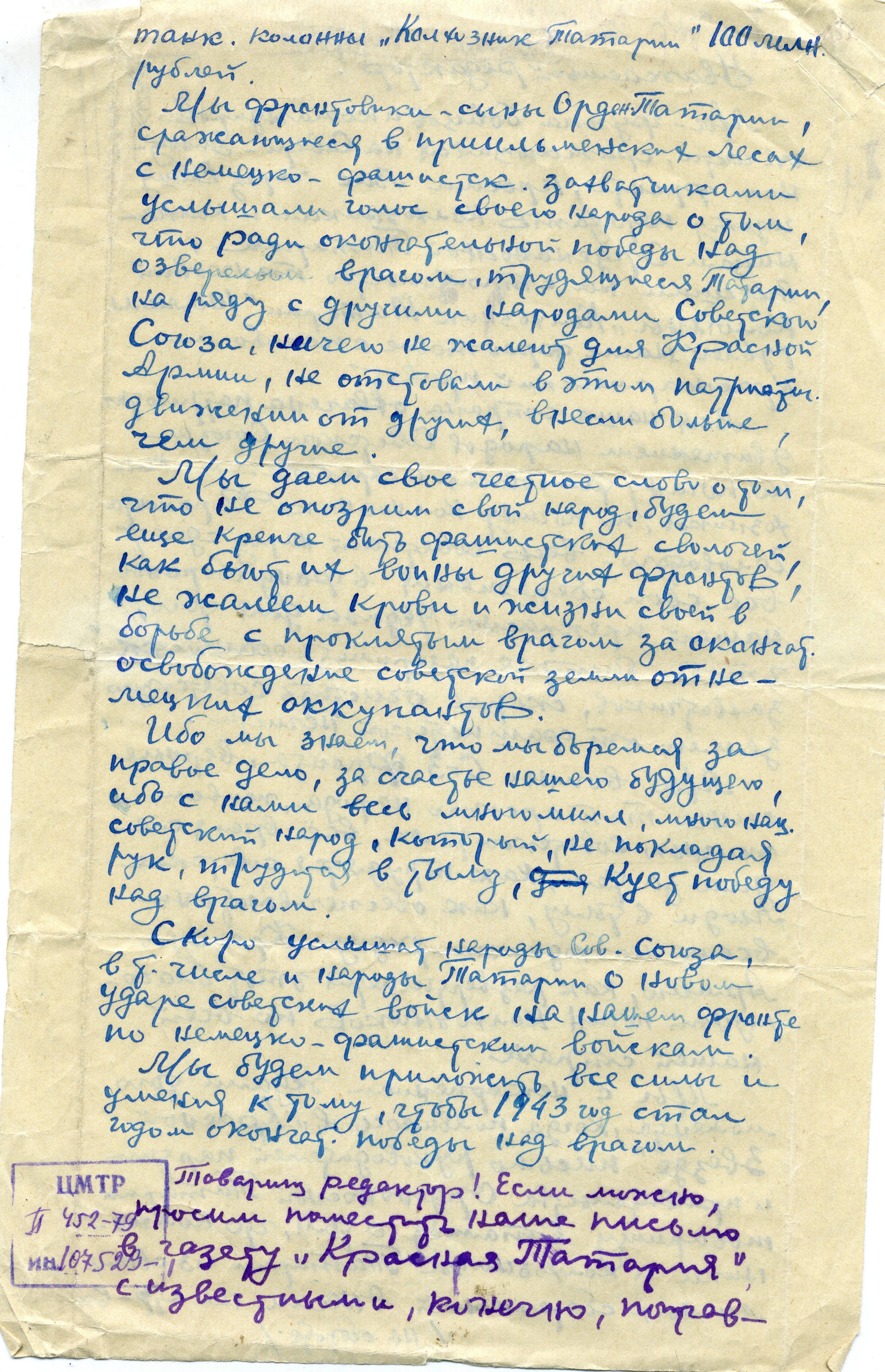 ЦМТР П452-79 ИН.107529-1 ПИСЬМО БОЙЦОВ РЕДАКТОРУ ГАЗЕТЫ «КРАСНАЯ ТАТАРИЯ». 02.01.1943.
