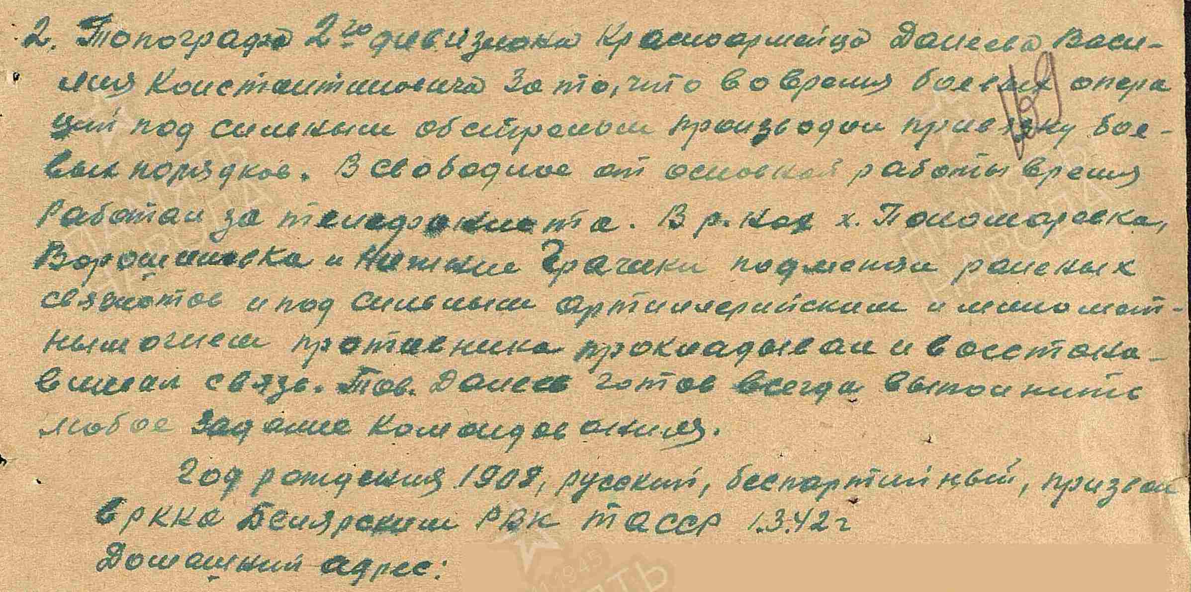 ДАНЕЕВ Василий Константинович, 1908, д. Николаевский Баран. До призыва в армию работал в к-зе «Волна Революции». Мобилизован 1 марта 1942 Билярским РВК. Воевал на Юго-Западном, 2 и 3 Украинском, Карельском фронте в составе 1 гв. А/ 3 гв. А/ 7 А/ 5 УдА/ 46 А. Участник освобождения Украины, Молдавии, боёв на Карельском перешейке и в Венгрии. Канд. ВКП(б). Красноармеец/ сержант, топограф/ телефонист 124 ГАП/ 320 ГАП; ком. топовычислительного отделения 320 ГАП 25 ГАБр 7 АртД (прорыва) РГК. Награждён медалями «За боевые заслуги», «За взятие Будапешта», орденом Красной Звезды. После войны жил в г. Казань.