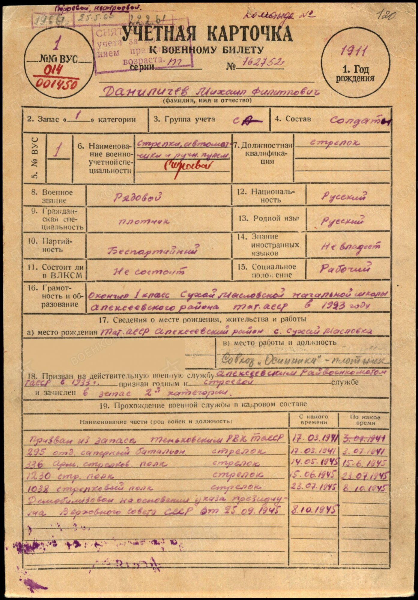 ДАНИЛИЧЕВ Михаил Филиппович, 1911, с. Масловка. На срочную службу мобилизован Алексеевским РВК в 1933. 17 марта 1941 призван из запаса Теньковским РВК. Красноармеец, 295 отд. сапёрный батальон 66 СК 21 А Западного фронта. 3 июля 1941 попал в плен. Освобождён 11 апр. 1945, направлен в стрелковый полк. Демобилизован в окт. 1945. Работал плотником в с-зе «Осинники», Камско-Устьинский р-н.