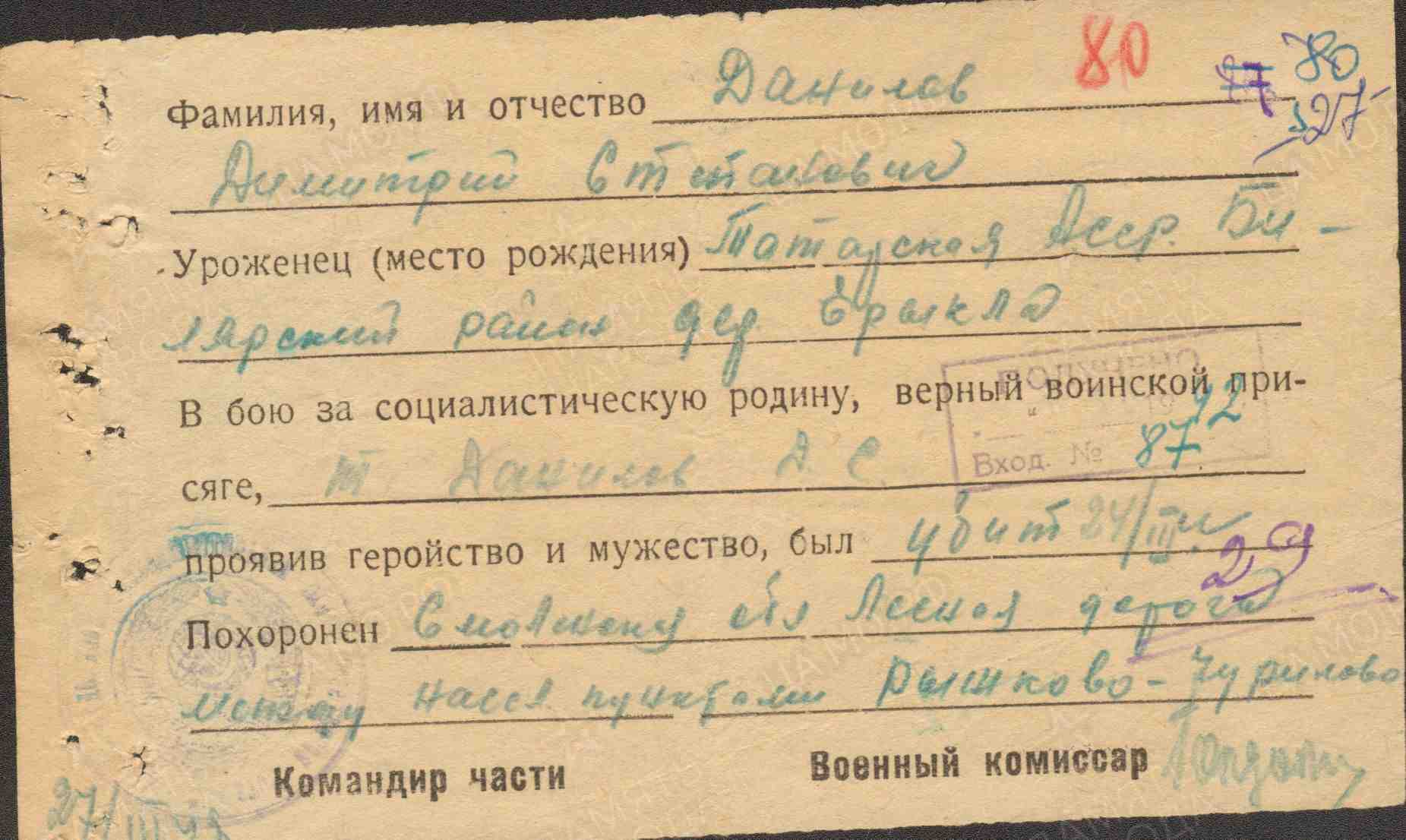 ДАНИЛОВ Дмитрий Степанович, 1918, д. Ерыкла. Член ВЛКСМ с 1937. Мобилизован 26 авг. 1941 Билярским РВК. Участник контрнаступления под Москвой на Западном фронте в составе 20 А/ 5 А. Ст. сержант, ком. отделения 413 развед. роты 352 СД. В бою, имея лёгкое ранение, ползком подобрался к двум огневым точкам противника и уничтожил их. Награждён медалью «За отвагу». Погиб 4 марта 1942 у д. Рыльково (Рыжково), Гжатский (Гагаринский) р-н, Смоленская обл.