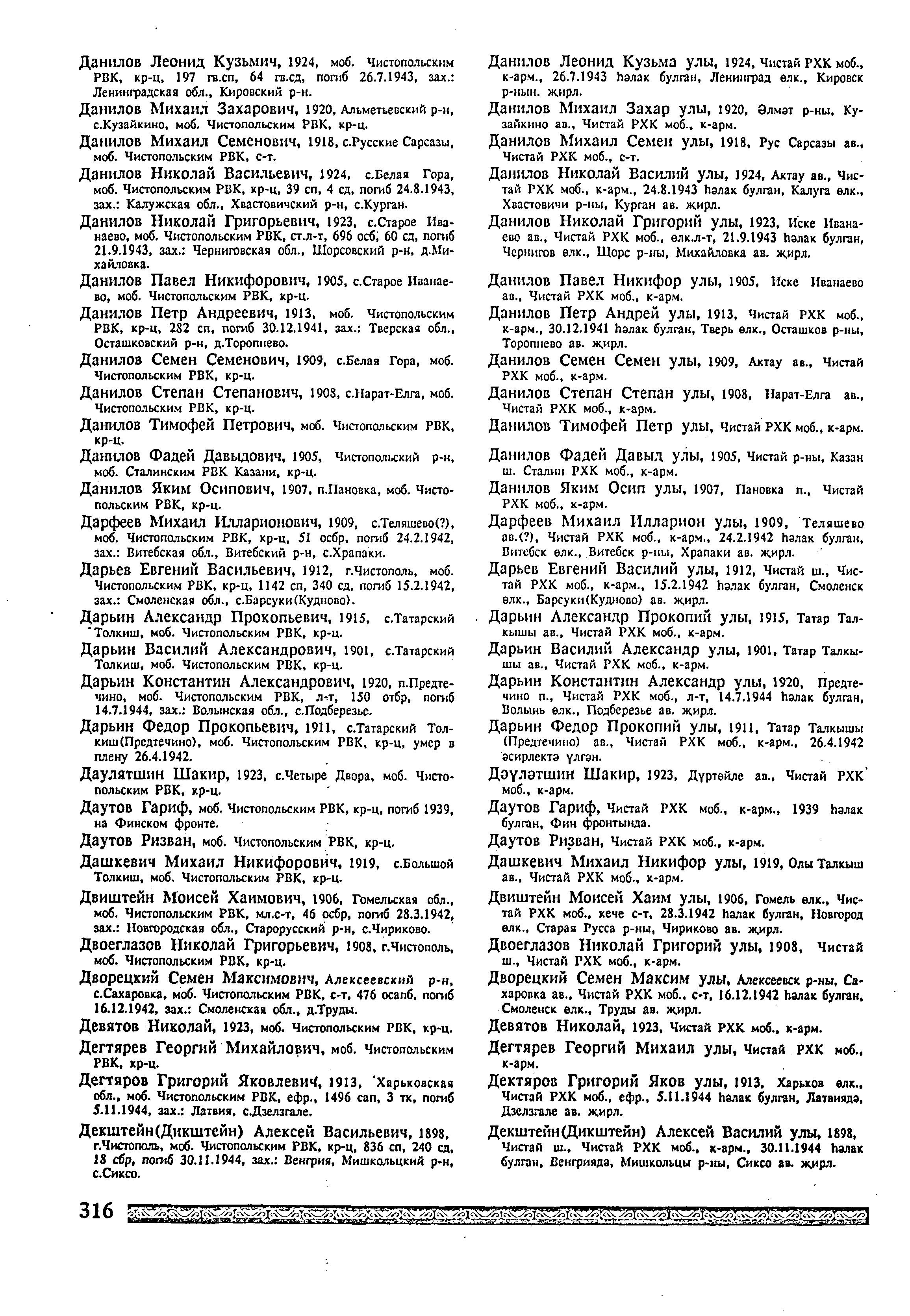 Родился 20 апреля 1911 г. в с. Татарский Толкиш (по другим сведениями в д. Предтечино) Чистопольского уезда Казанской губернии. Призван на фронт 27 мая 1941 г. Чистопольским РВК. Попал в плен под Оршей 23 июня 1941 г. Содержался в шталаге IV B. Лагерный номер 125123. Стрелок 208 сп красноармеец Дарьин Фёдор Прокопьевич погиб в плену 26 апреля 1942 г. Захоронен в братской могиле в Германии, земля Тюрингия, округ Зуль, р-н Майнинген, г. Вазунген.
