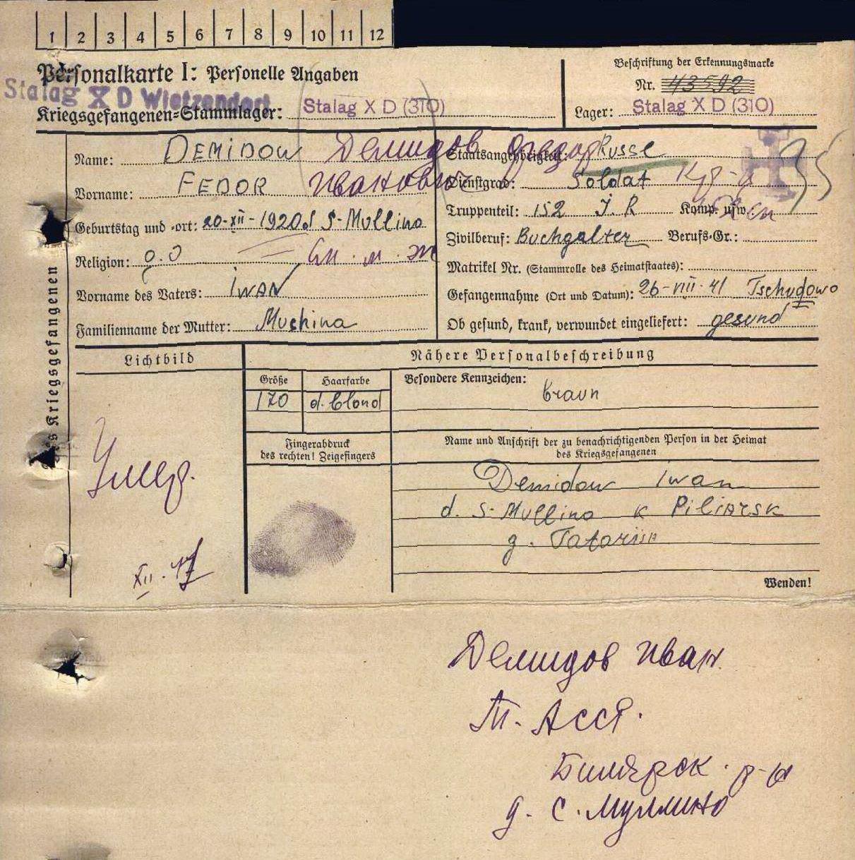 ДЕМИДОВ Фёдор Иванович, 1920, д. Старое Муллино. Мобилизован 26 сент. 1940. Член ВЛКСМ. Красноармеец, 142 СП 5 СД 11 А/ 27 А Северо-Западного фронта. Попал в плен 26 авг. 1941 в р-не ст. Чудово, Новгородская обл. Содержался в лагере военнопленных № 310 X D. Витцендорф, Нижняя Саксония, Германия. Умер в дек. 1941.