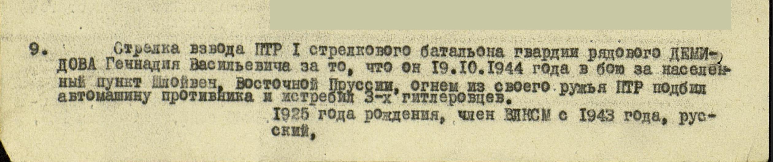 ДЕМИДОВ Геннадий Васильевич, 1925, с. Алексеевское. Мобилизован Алексеевским РВК 6 сентября 1943 г. Гв. красноармеец, стрелок взвода ПТР 17 гв. СП 5 гв. СД 8 гв. СК 11 гв. А 3 Белорус. Ф. Член ВЛКСМ. Награждён медалью "За отвагу" (октябрь 1944, бои в Восточной Пруссии), орденом Отечественной войны 1 ст. (1985).