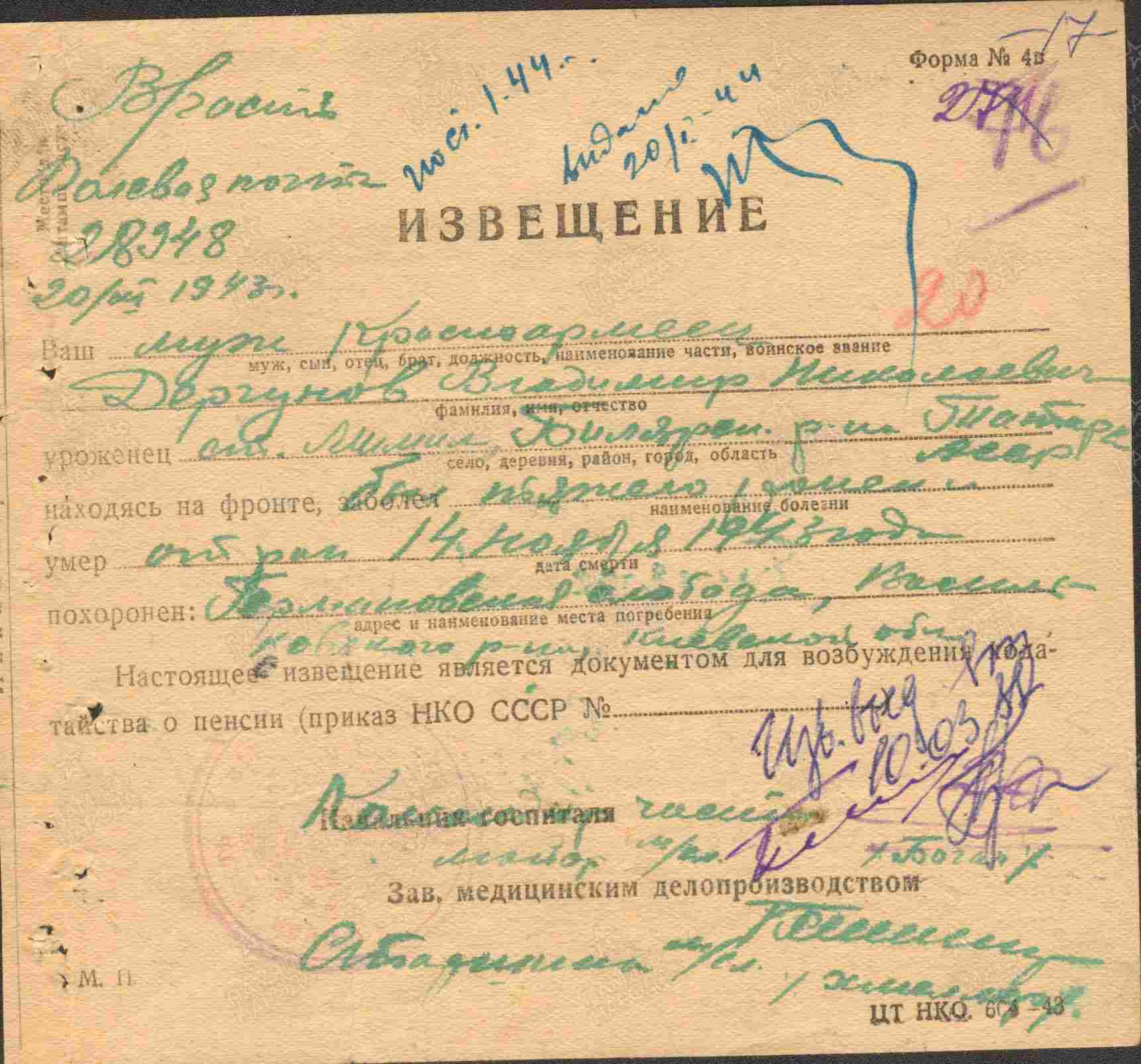 ДЕРГУНОВ Владимир Николаевич, 1907, д. Старое Муллино. Мобилизован Теньковским РВК в авг. 1941. 20 окт. 1942 через Казанский ВПП выбыл на фронт в составе команды 106. Гв. красноармеец, сапёр 106 отд. гв. СапБ 92 гв. СД Воронежского фронта, 37 А Степного/ 2 Украинского фронта.Участник битвы на Курской дуге и Днепре. Умер 14 нояб. 1943 от осколочного ранения в живот в 396 отд. МСБ 240 СД, с. Германовская (Красная) Слобода, Васильковский (Обуховский) р-н, Киевская обл., УкрССР.