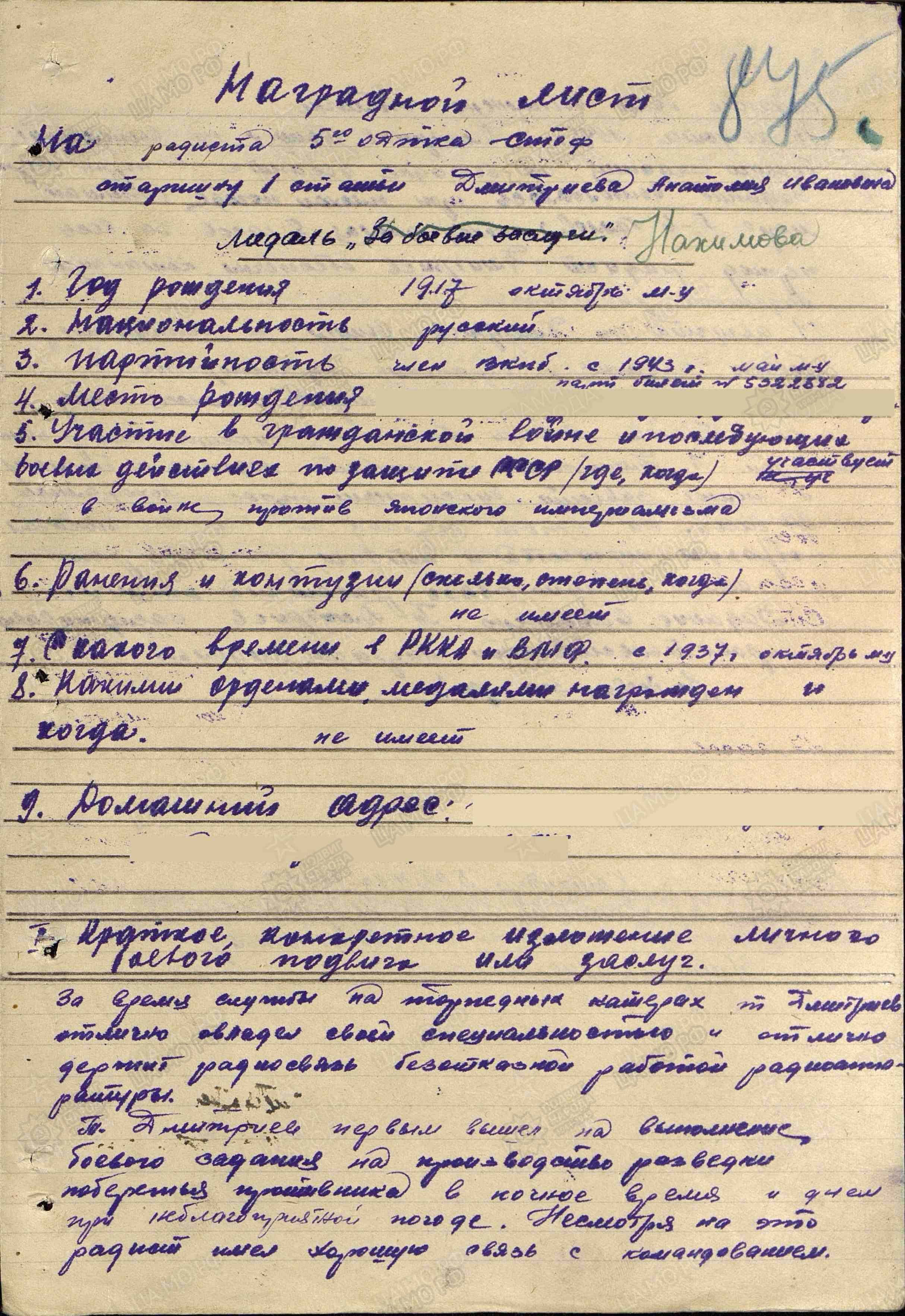 ДМИТРИЕВ Анатолий Иванович, 1917, д. Николаевский Баран. Мобилизован в 1937 г. Служил на флоте. В 1945 г. - старшина 1 ст., радист 5 отдельного дивизиона торпедных катеров Северной Тихоокеанской флотилии. Принимал участие в войне с Японией. Награждён медалью Нахимова (представлялся к медали "За боевые заслуги"), орденом Отечественной войны 2 ст. (1985).