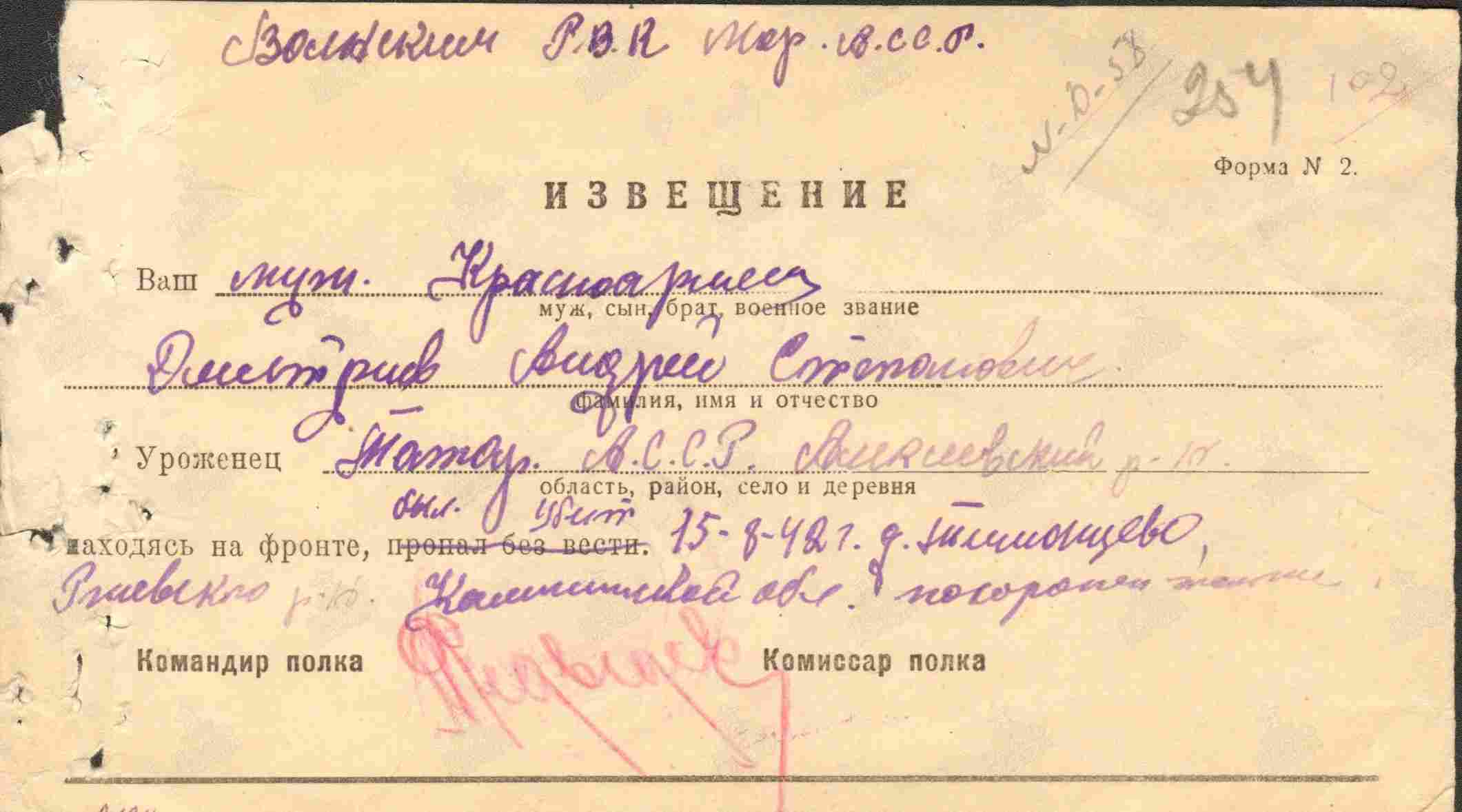 ДМИТРИЕВ Андрей Степанович, 1898, д. Войкино. Мобилизован в 1942 Волжским РВК МарАССР. Красноармеец, стрелок 1198 СП 359 СД 30 А Калининского фронта. Погиб 15 авг. 1942, д. Тимонцево/ д. Бахмутово, Ржевский р-н. Увековечен на братском захоронении на 21 км трассы Ржев – Осташков, г. Ржев, с.п. Победа, Калининская (Тверская) обл.