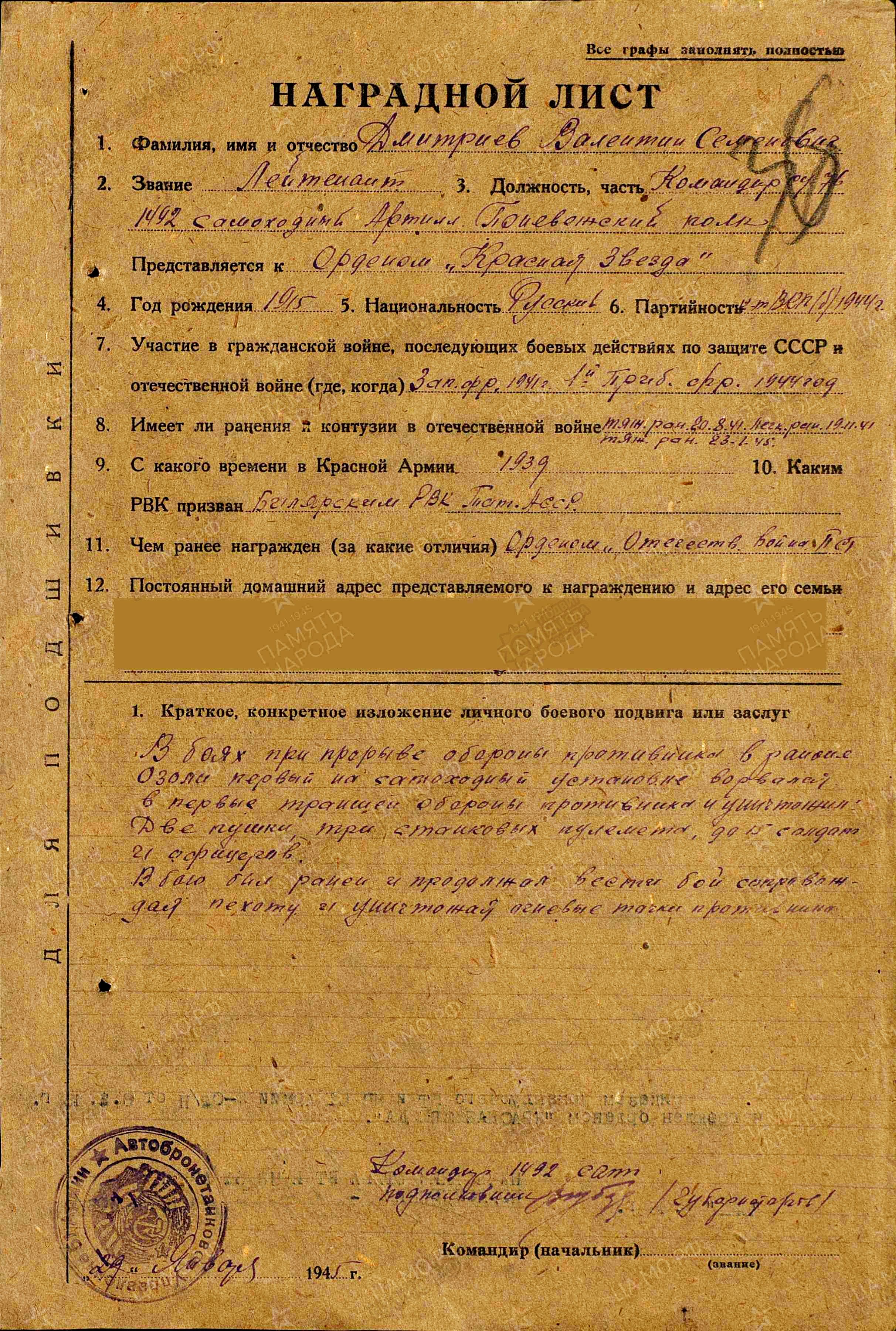 ДМИТРИЕВ Валентин Семёнович, 1915, д. Николаевский Баран. Мобилизован Билярским РВК в 1939 г. С 1941 г. воевал на Западном фронте. Тяжело ранен 20 авг. 1941, легко ранен 19 ноября 1941. С 1944 г. - на 1 Прибалт. фронте. Лейтенант, командир СУ-76 1492 (лёгкого) САП. В боях на территории Латвийской ССР отличился в бою в августе 1944 г., представлен к ордену Отечественной войны 1 ст., награждён орденом Отечественной войны 2 ст. В январе 1945 г. отличился в бою при прорыве обороны противника, где был вновь тяжело ранен. В авг. 1945 принимал участие в войне с Японией. Награждён орденом Красной Звезды, медалью "За победу над Германией". После войны жил в с. Билярск.
