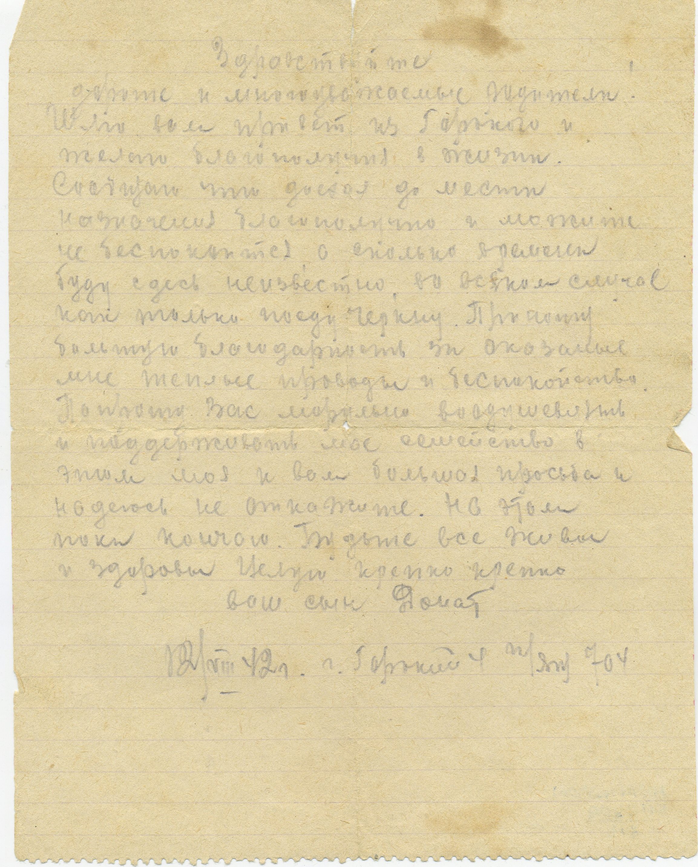 Здравствуйте, родные и многоуважаемые родители! Шлю Вам привет из Горького и желаю благополучия в жизни. Сообщаю, что доехал до места назначения благополучно и можете не беспокоиться, а сколько времени буду здесь, неизвестно. Во всяком случае, как только поеду, черкну.