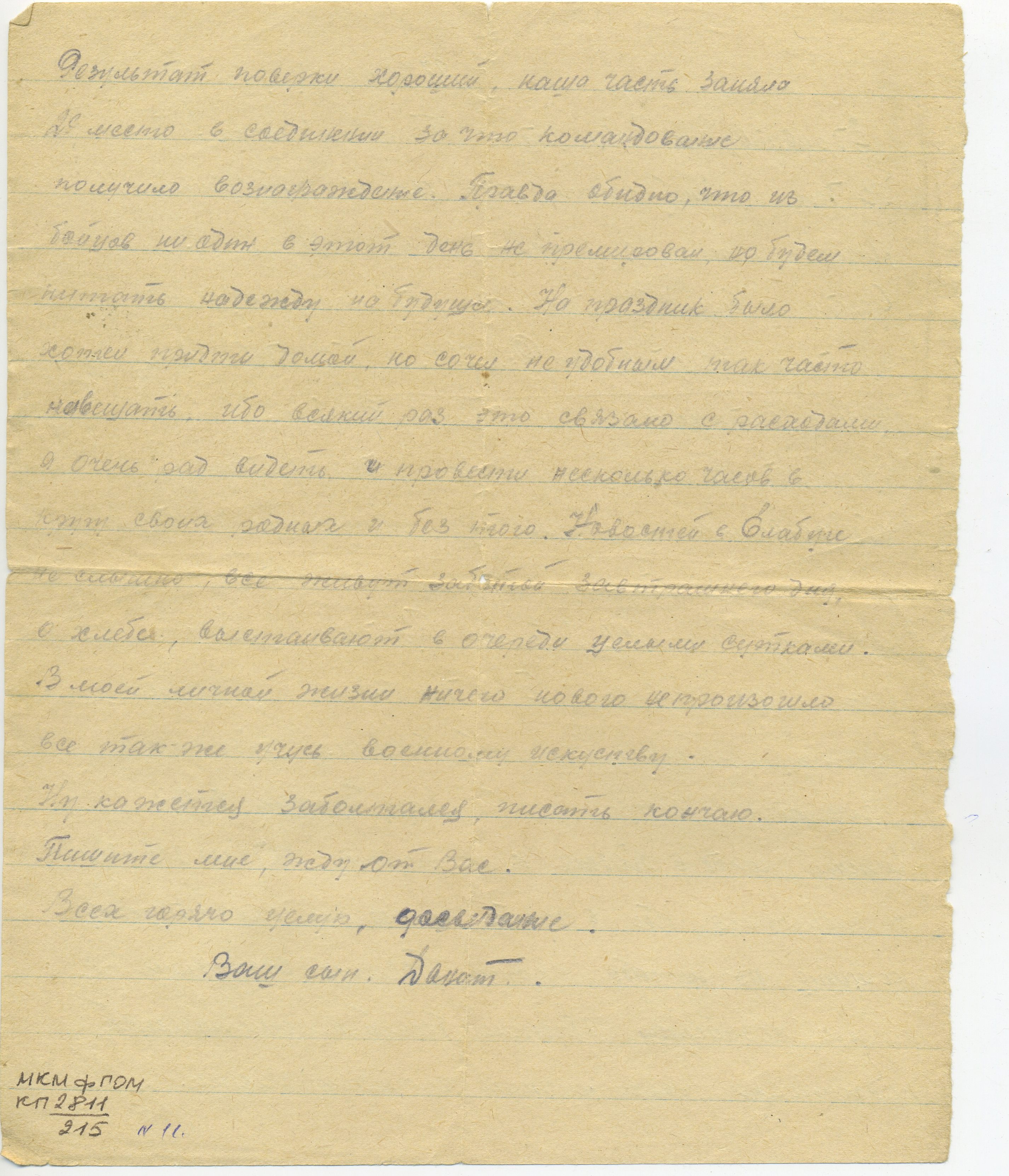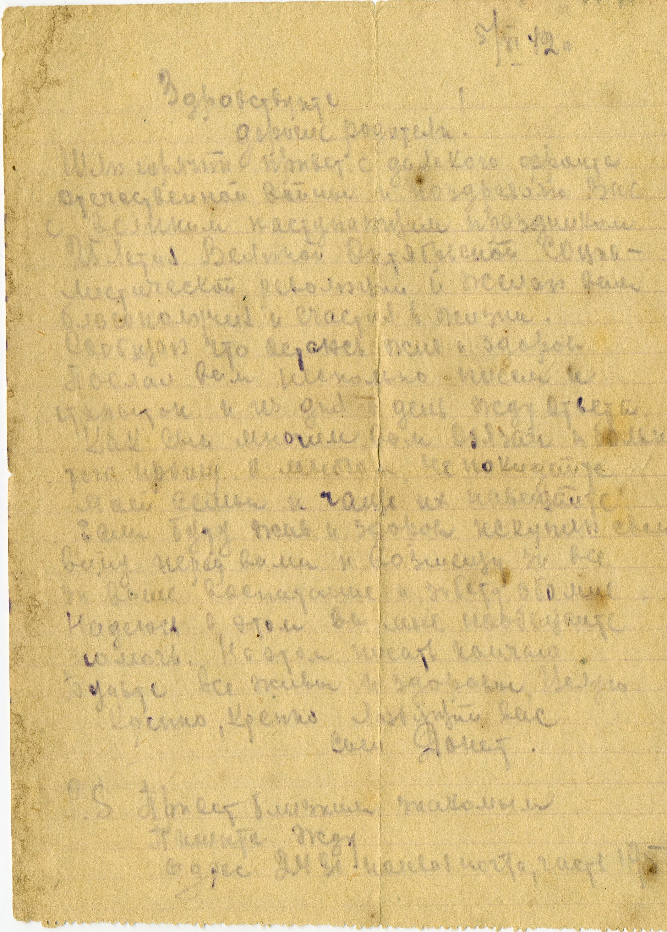 Здравствуйте, дорогие родители! Шлю горячий привет с далекого фронта Отечественной войны и поздравляю Вас с великим наступающим праздником 25-летия Великой Октябрьской Социалистической революции, желаю Вам благополучия и счастья в жизни. Сообщаю, что остаюсь жив и здоров. Послал Вам несколько писем, открыток и из дня в день жду ответа. Как сын, я многим вам обязан, и больше того прошу о многом – не покидать мою семью и почаще навещать. Если буду жив и здоров, искуплю свою вину перед вами и возмещу за все, за ваше воспитание и заботу обо мне. Надеюсь в этом вы мне пообещаете помочь На этом писать кончаю. Будьте все живы и здоровы. Целую крепко, крепко. Любящий вас сын Донат.