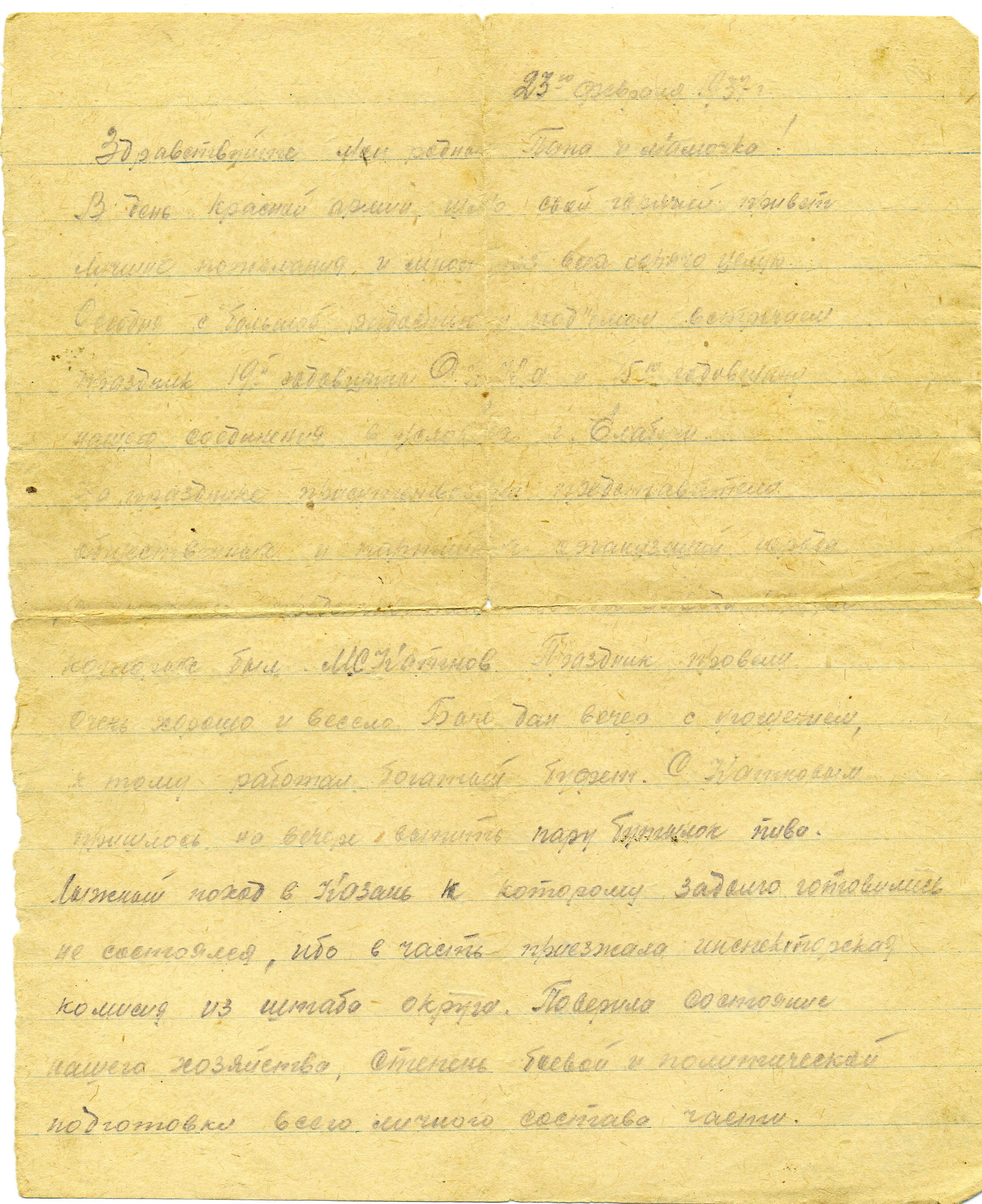 В день Красной армии шлю горячий привет, лучшие пожелания и много раз всех горячо целую. Сегодня с большой радостью и подъемом встречаем праздник 10-й годовщины РККА и 15-ую годовщину нашего соединения в условиях г.Елабуга. На празднике присутствовали представители общественных и партийных организаций города. …которого был М.С.Катнов. Праздник прошел очень хорошо и весело. Был дан вечер с угощением, к тому работал богатый буфет. С Катновым пришлось на вечере выпить пару бутылок пива. Лыжный поход в Казань, к которому задолго готовились, не состоялся, ибо в часть приезжала инспекторская комиссия из штаба округа. Поверила состояние нашего хозяйства, степень боевой и политической подготовки личного состава части. Результат поверки хороший, наша часть заняла второе место в соединении, за что командование получило вознаграждение. Правда, обидно, что из бойцов никто в этот день не премирован, но будем питать надежду на будущее. На праздник было хотел прийти домой, но счел неудобным так часто навещать, ибо всякий раз это связано с расходами. Я очень рад видеть и провести несколько часов в кругу своих родных и без того. Новостей в Елабуге не слышно, все живут заботой завтрашнего дня о хлебе, выстаивают в очереди целыми сутками. В моей личной жизни ничего нового не произошло, все так же учусь военному искусству.