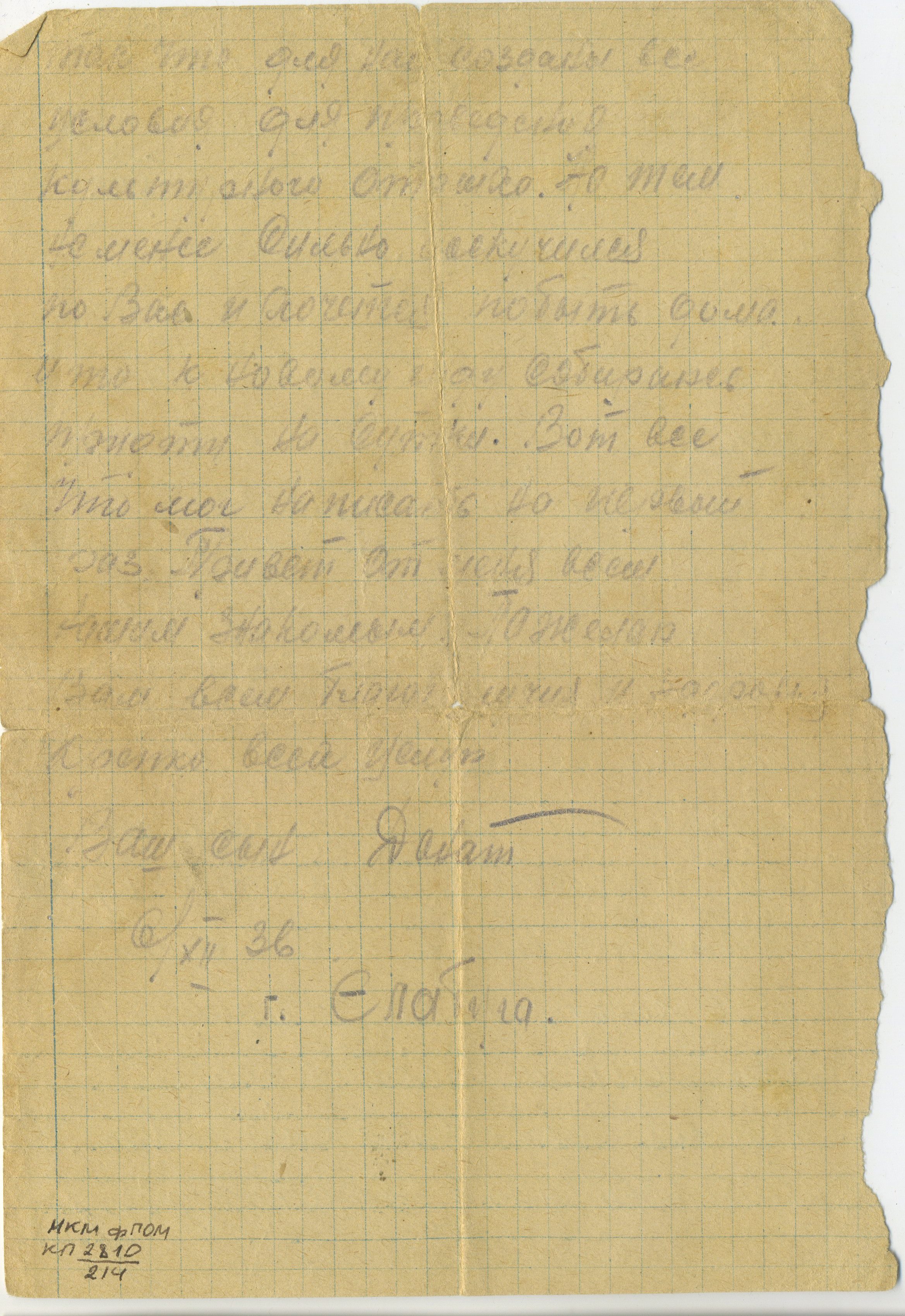 Здравствуйте, Папа, Мамочка, мои маленькие сестренки! Шлю всем красноармейский привет из Елабуги и крепко крепко целую. Сегодня исполнилось ровно два месяца, как я обрел звание и честь воина Красной Армии. За эти два месяца пришлось многое испытать и многому научиться. Но одно плохо, не хватает времени. Чувствую себя здоровым, крепким, стал отличным физкультурником. Взял на себя обязательство стать отличником боевой и политической подготовки. Через шесть месяцев, т.е. в мае, кончаю школу и получу звание младшего командира. При школе есть свой клуб, кино, библиотека и т.д. во много раз лучше, чем в Бондюге. Так что для нас созданы все условия для проведения культурного отдыха. Сильно соскучился по Вас и хочется побыть дома. К новому году собираюсь прийти на сутки. Вот все, что мог написать на первый раз. Привет от меня всем нашим знакомым. Желаю вам благополучия и здоровья. Крепко целую. Ваш сын Донат. 6.12.1936 г. Елабуга.