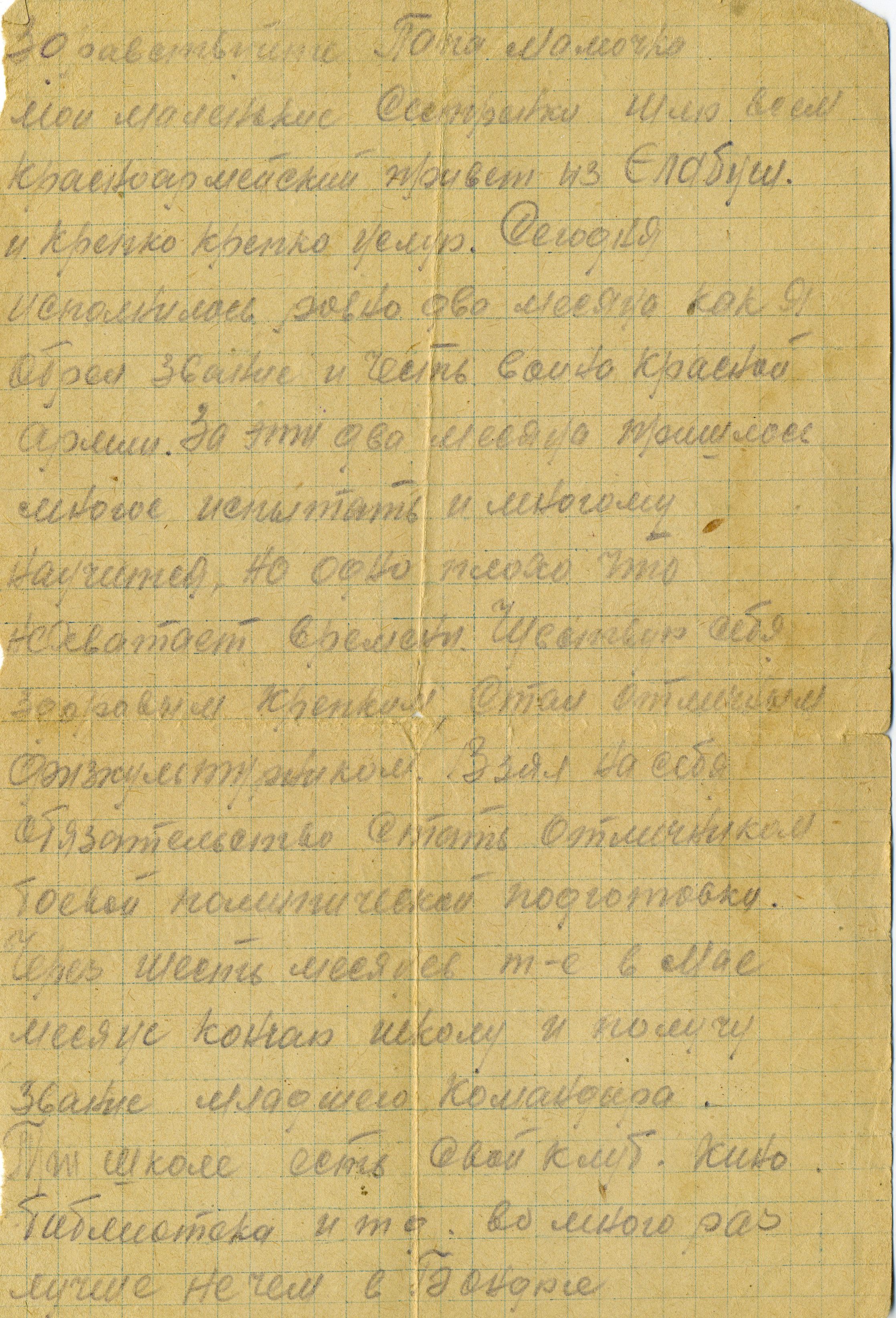 «Сегодня исполнилось ровно два месяца, как я обрел звание и честь воина Красной Армии. Чувствую себя здоровым, крепким, стал отличным физкультурником, взял на себя обязательство стать отличником боевой и политической подготовки. Через шесть месяцев заканчиваю школу и получу звание младшего командира», – с гордостью пишет Д.Добрынин в письме от 6 декабря 1936 года из Елабуги.