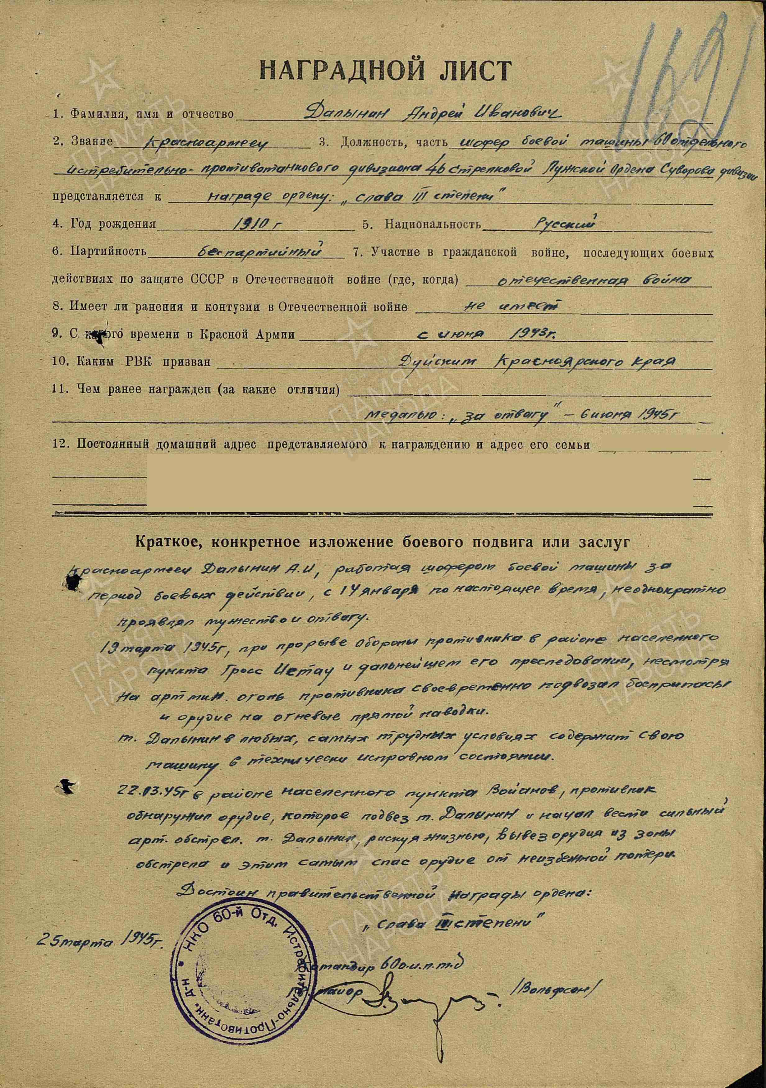 ДОЛИНИН Андрей Иванович, 1910, с. Билярск. Мобилизован 23 июня 1943 Дудинским РВК, Таймырский НО Красноярского края. Красноармеец, шофёр 60 отд. ИПТДн 46 СД 55 А/ 67 А/ 23 А/ 21 А/ 8 А Ленинградского фронта, 2 УдА 2 Белорусского фронта. Награждён медалями «За отвагу», «За боевые заслуги».