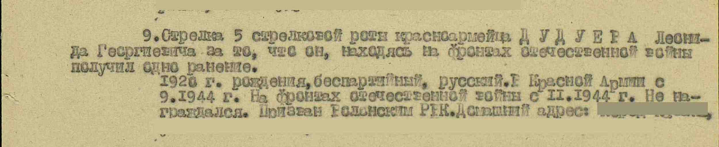 ДУДУЕВ Леонид Георгиевич, 1920, с. Алексеевское. Мобилизован Волжским РВК МарАССР в сентябре 1944. Красноармеец, стрелок 1159 СП 351 СД 4 УкрФ. В боях был ранен. Награждён медалью "За отвагу" (1945), орденом Отечественной войны 2 ст. (1985).