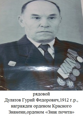 Дулатов Гурий Федорович родился в 1912 году в деревне Чувашское Бурнаево Алькеевского района ТАССР. Фронтовик. Участник Великой Отечественной войны 1941-1945гг. Призван Кузнечихинским РВК в 1941 году. Награжден орденом Красного Знамени, орденом "Знак почета". Умер в 1995 году. (Фотография и материалы предоставлены Чувашско-Бурнаевским сельским поселением)
