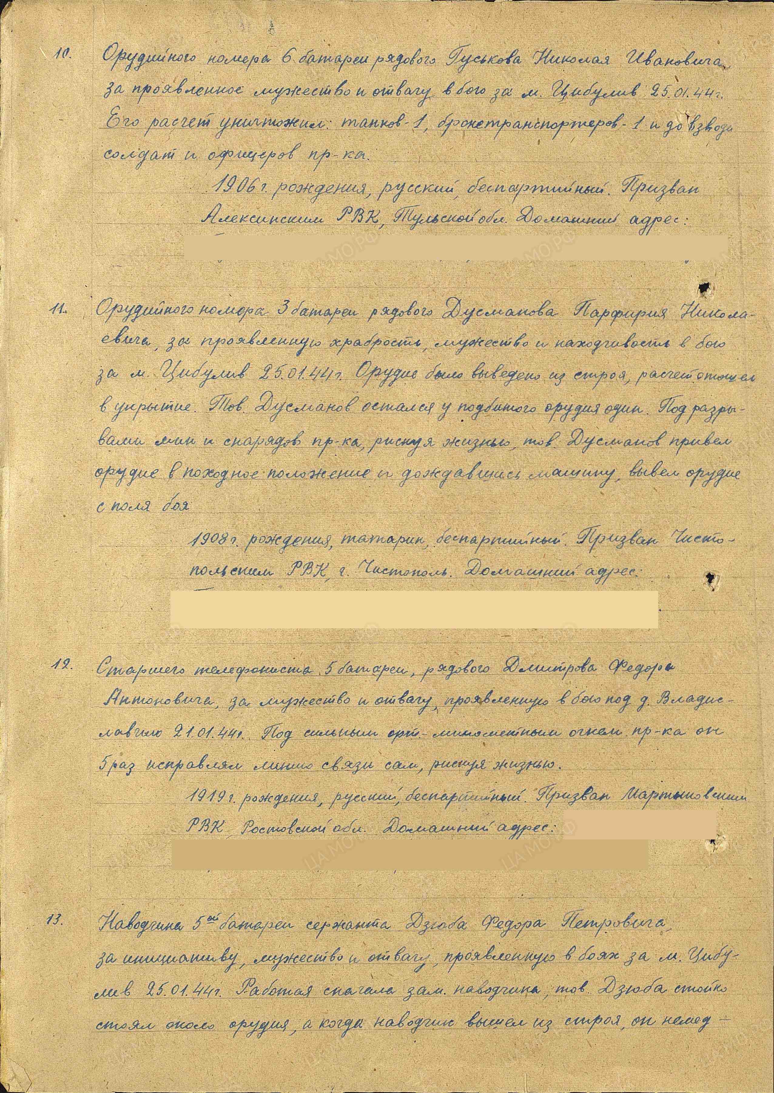 Порфирий Николаевич Дусманов родился в 1908 г. в с.Четырчи, Чистопольского района, ТАССР. 20 марта 1943 г. призван в ряды Красной Армией Чистопольским военным комиссариатом. Служил в должности орудийного номера 3 батальона.