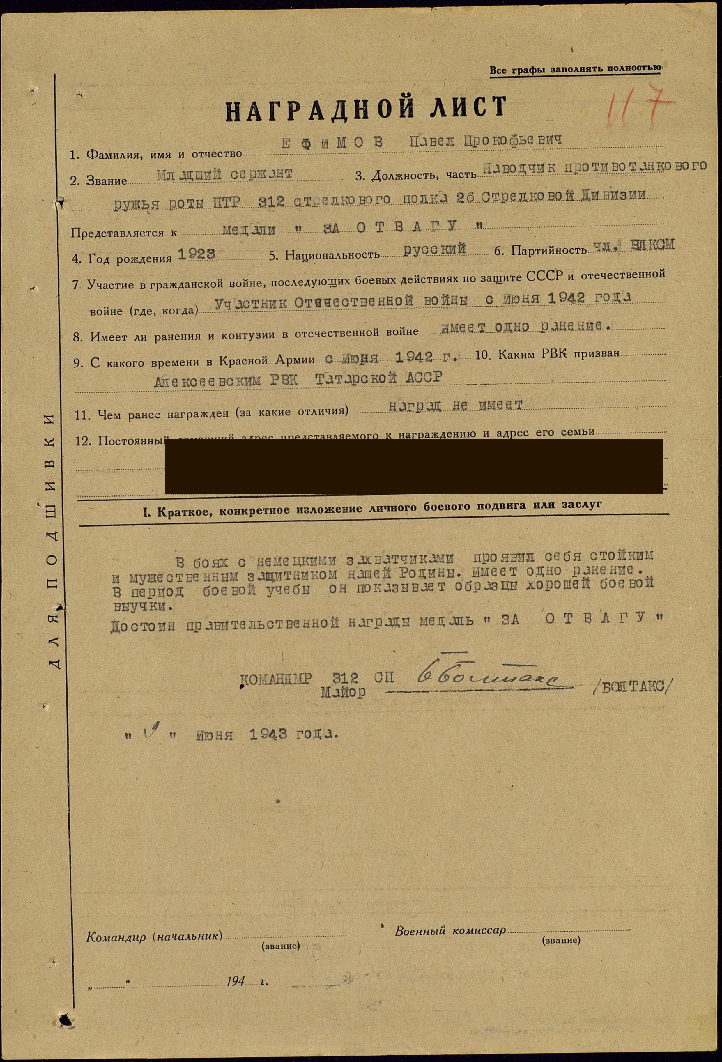 ЕФИМОВ Павел Прокофьевич, 1923, д. Гумарнаволок, Пудогожский р-н, Карелия. Член ВЛКСМ. Мобилизован Алексеевским РВК 4 июня 1942. Воевал на Северо-Западном, 2 Прибалтийском фронте в составе 11 А, 34 А, 10 гв. А, 3 УдА, 42 А. В боях перенёс три ранения. В 1942 проходил лечение в ЭГ 2888, п. Лыкошино, Бологовский р-н, Калининская (Тверская) обл. В 1943 - красноармеец/ мл. сержант, наводчик ПТР 312 СП 26 СД. В 1944 - гв. красноармеец, телефонист 314 гв. ИПТАП 6 отд. гв. ИПТАБр. Тяжело ранен 17 сент. 1944, подобран бойцами другой части и направлен в МСБ 56 СД. Ошибочно учтён пропавшим без вести. Демобилизован в дек. 1944 по ранению. После войны жил в г. Ставрополь. Награждён медалью "За отвагу", орденом Отечественной войны 1 ст. (1985). Умер в 2008.