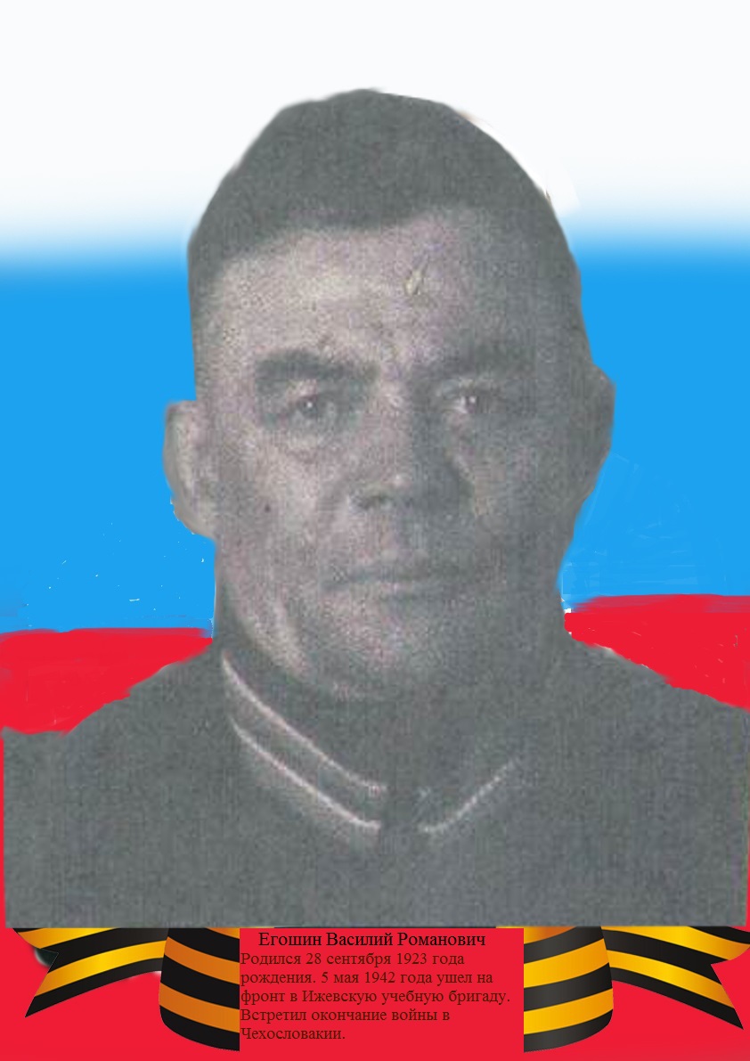Егошин Василий Романович, 1923 года рождения. 5 мая 1942 года ушел на фронт и был направлен в Ижевскую учебную бригаду. 10 июня 1942 г. был отправлен на фронт, но до фронта не доехал, был направлен в Воронежское военное училище. Был направлен на Сталинградский фронт, где в сентябре был контужен. После выписки из госпиталя был направлен в свою часть, где был вторично ранен в руку. И опять госпиталь. А затем, опять фронт. От Белоруссии до Кешемберга, от Кешемберга до Берлина. Встретил окончание войны в Чехословакии. Домой вернулся, 11 ноября 1945 г. Демобилизовался в 1945 г. После окончания войны работал в колхозе, а затем совхозе «Чернышевский», электриком. В 1980 г. вышел на пенсию.
