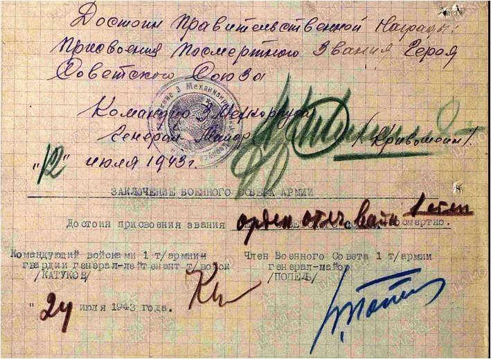Посмертно представлен к званию Героя командующим войсками 1 танковой армии гвардии генерал-лейтенантом Катуковым 12 июля 1943 г.