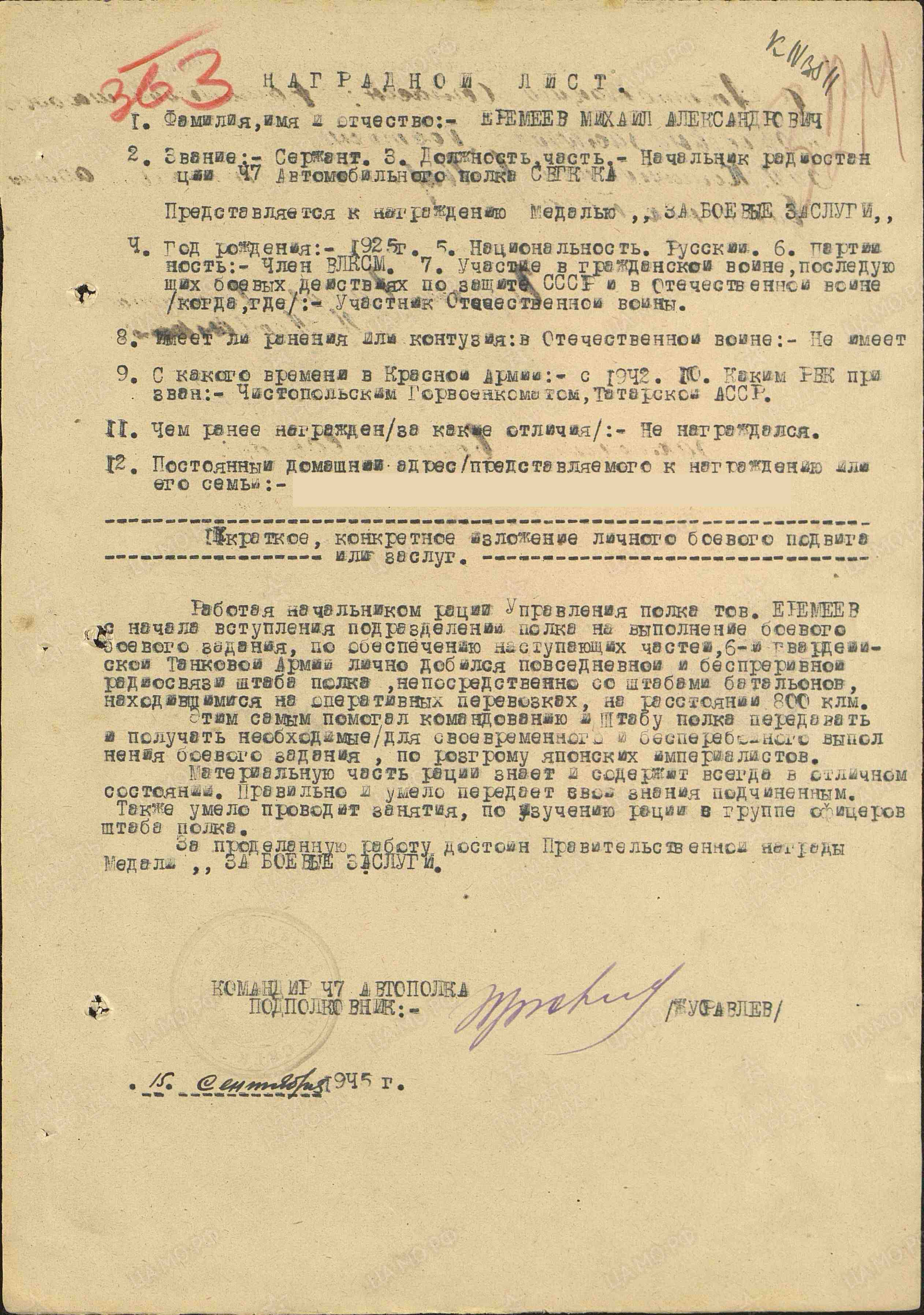 Михаил Александрович Еремеев родился в 1925 г. в г.Москве, Московской области. Проживал в г.Чистополе, ТАССР. В 1942 г. призван в ряды Красной Армии Чистопольским военным комиссариатом. Служил в звании сержанта, в должности начальника радиостанции 47 автомобильного полка СВГК КА.
