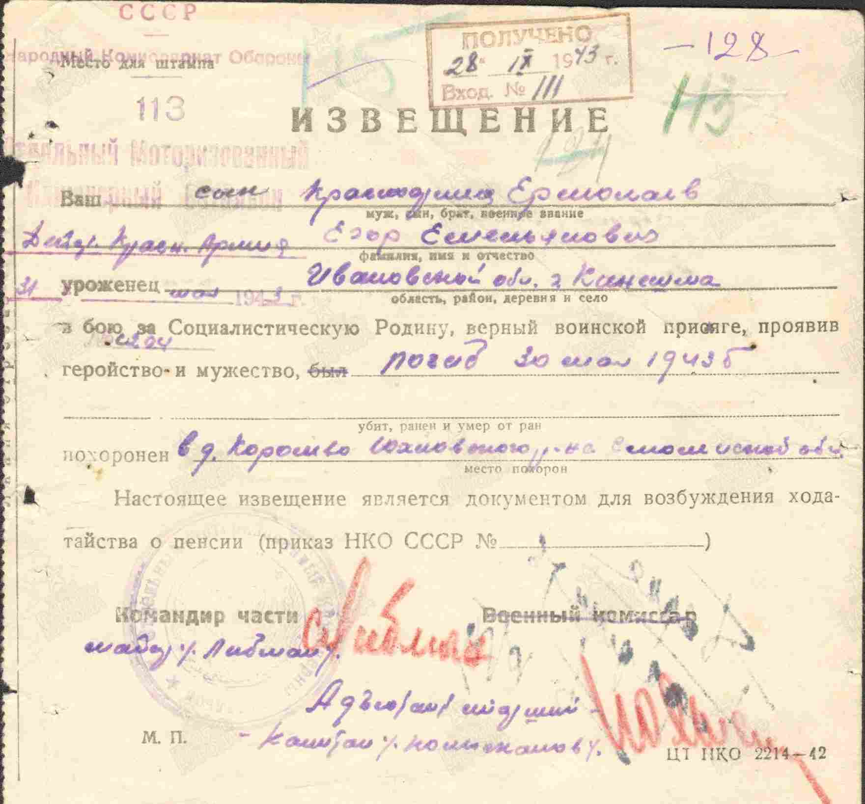 ЕРМОЛАЕВ Егор Емельянович, 1919, д. Малый Красный Яр/ г. Кинешма, Ивановская обл. Мобилизован Алексеевским РВК 23 мая 1941. Красноармеец, сапёр 113 отд. мото-инженерного батальона Западного фронта. Погиб от взрыва мины при разминировании, д. Королёво, Юхновский (Медынсий?) р-н, Калужская обл.