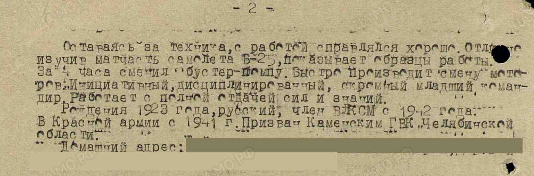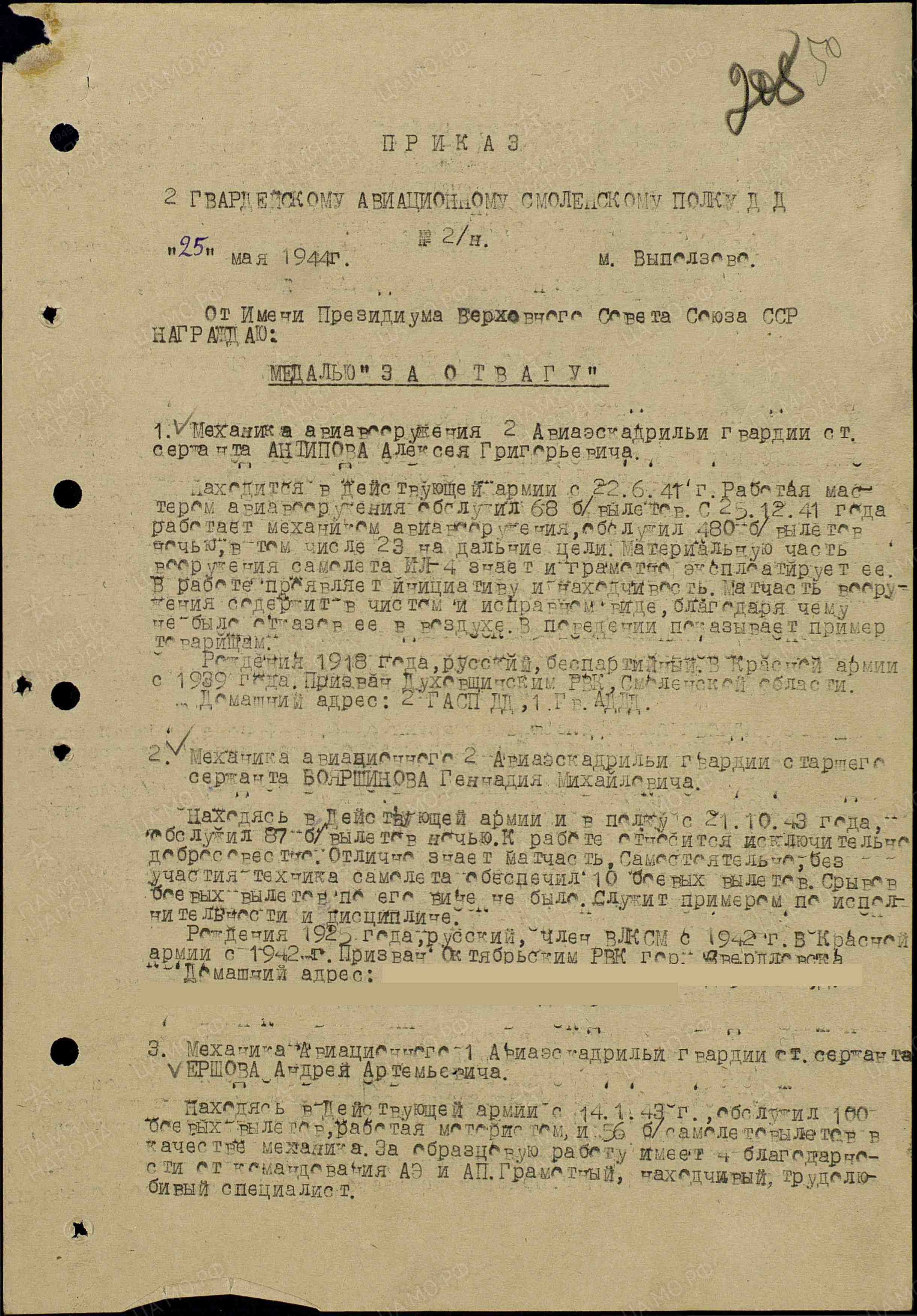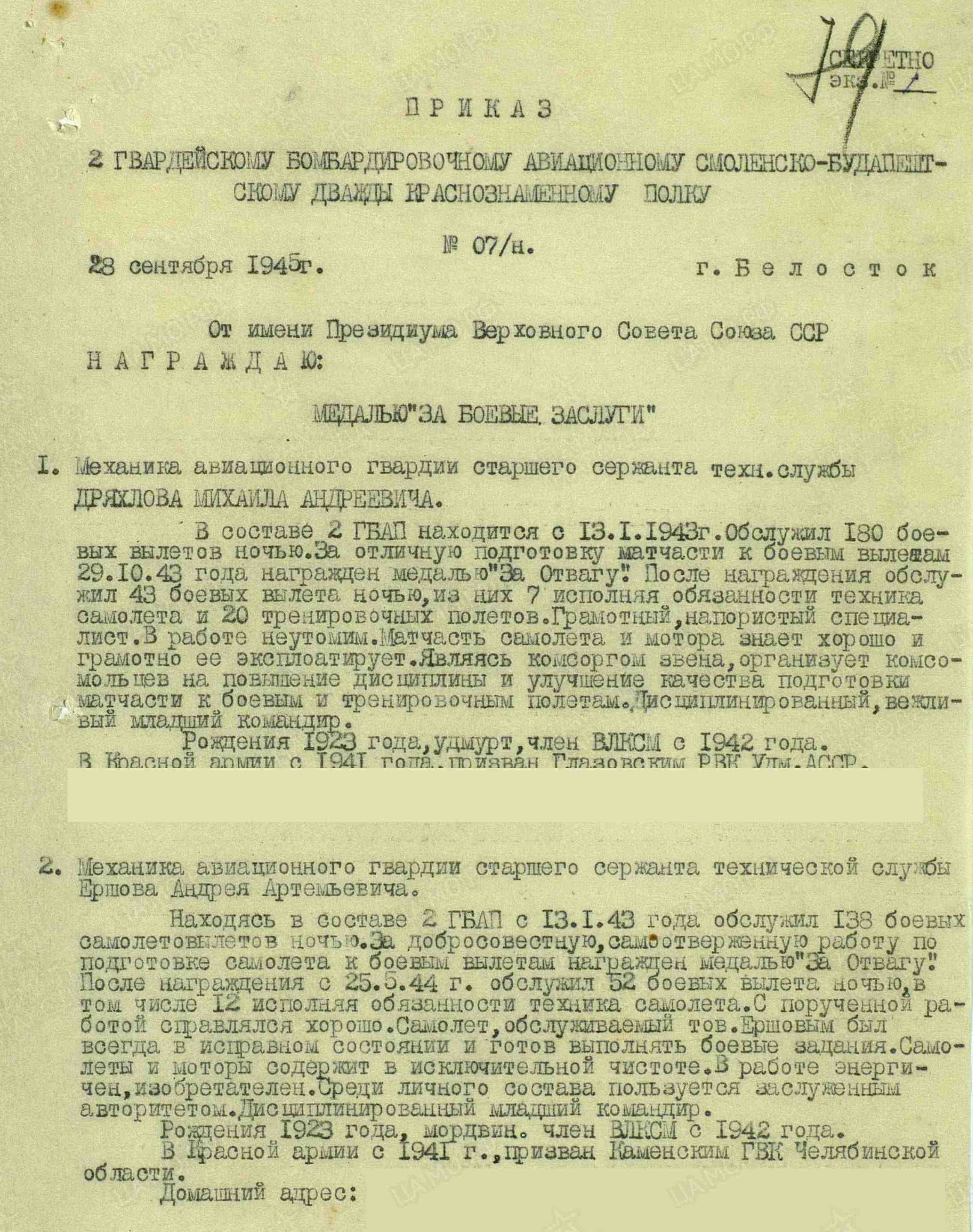 ЕРШОВ Андрей Артемьевич, 1923, д. Войкино. Член ВЛКСМ. Мобилизован Каменским РВК Челябинской обл. в 1941. Гв. ст. сержант/ старшина технической службы, авиамеханик 2 гв. авиац. бомбардировочного полка дальнего действия. Награждён медалями "За отвагу", "За боевые заслуги", «За взятие Берлина», орденом Отечественной войны 2 ст. (1985). После войны жил в г. Казань. Скончался в 2016.