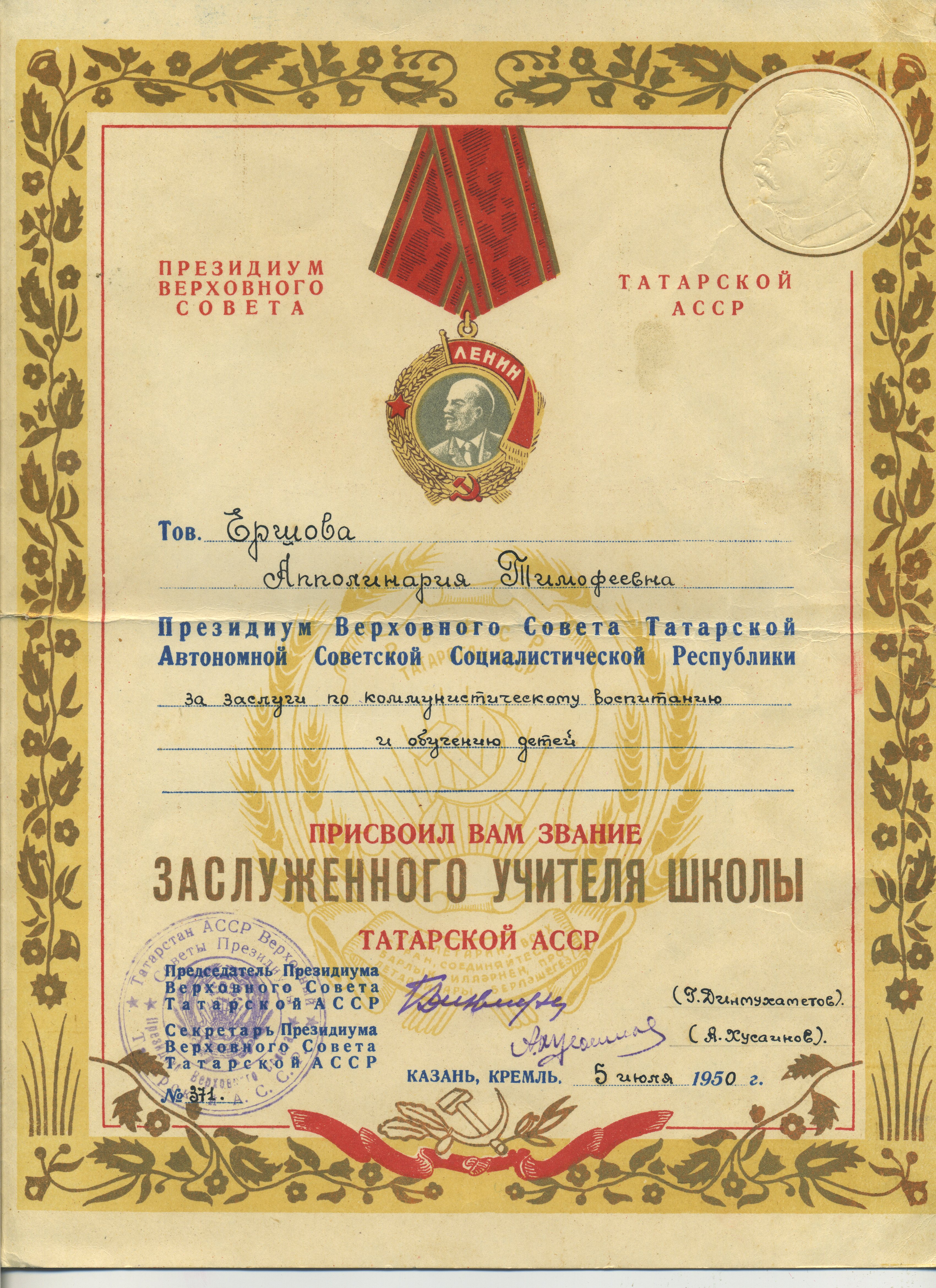 Родилась 5.01.1894 г. Кавалер ордена Ленина (1949), заслуженный учитель ТАССР (1950), бессменный завуч Бондюжской школы №1.