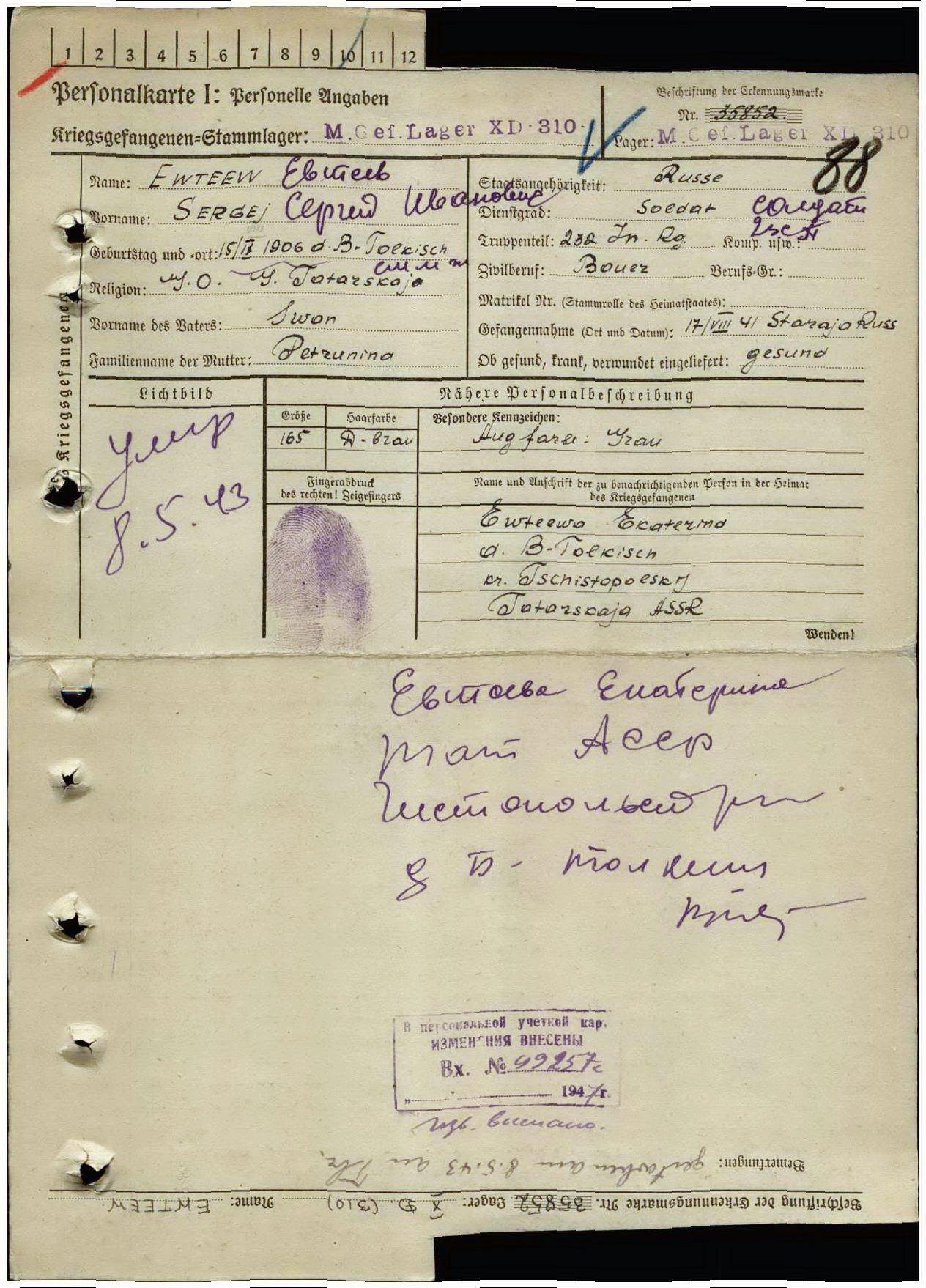 Родился 15 сентября 1906 г. в с. Большой Толкиш Чистопольского уезда Казанской губернии. Стрелок. Призван на фронт 14 августа 1941 г. Чистопольским РВК. Пленён 17 июля 1941 г. под Старой Руссой. Содержался в шталаге X D (310). Лагерный номер 35852. Рядовой Евтеев Сергей Иванович погиб в плену 8 мая 1943 г. Похоронен в местечке Витцендорф.