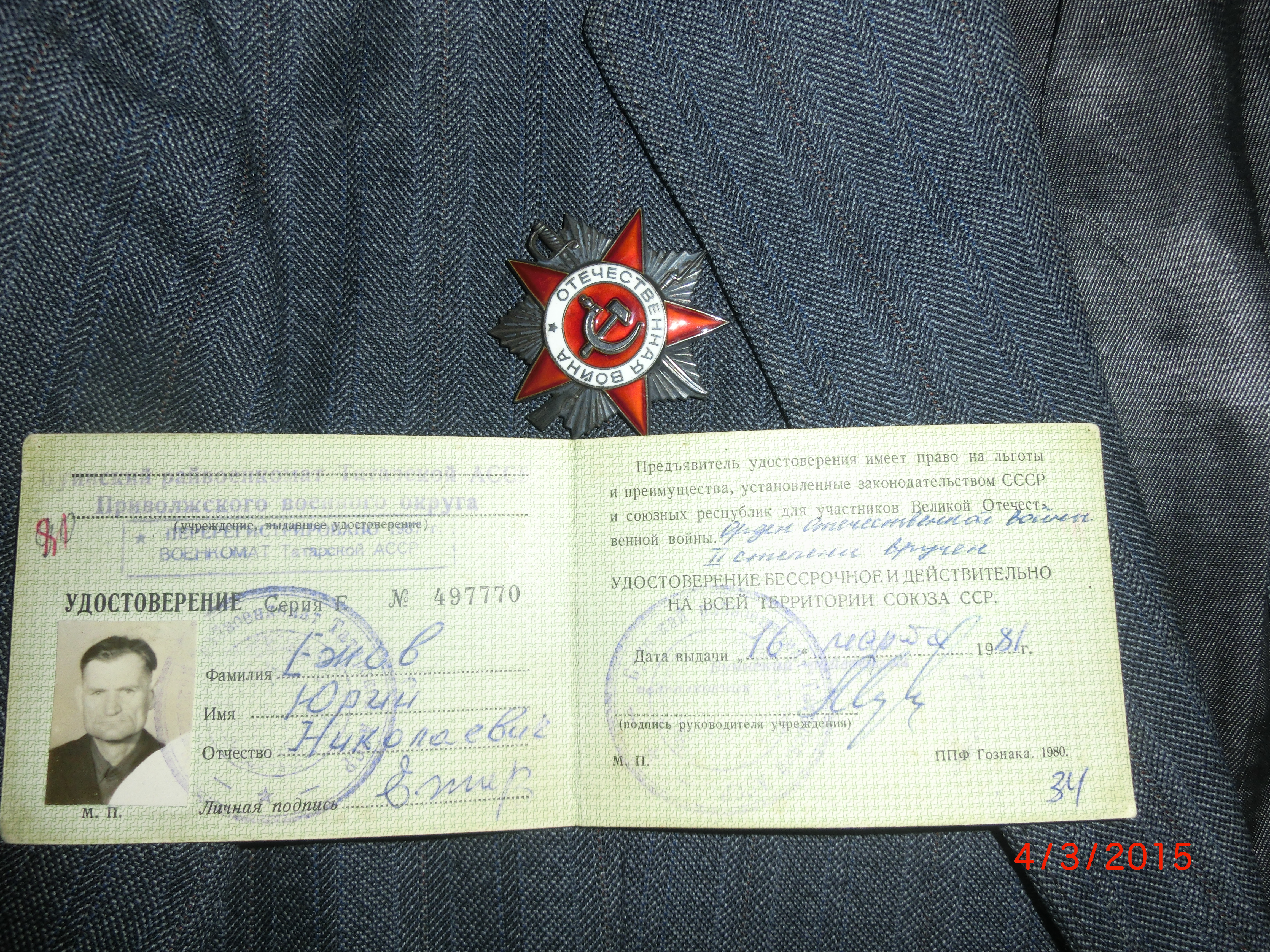 Ежов Юрий Николаевич.23 октября 1925 года рождения. В 1942 году окончил 7 классов школы имени Луначарского. Затем его отправили в д. Красное озеро на работу. Там их не кормили и они убежали. После этого он стал работать в колхозе. 1 января 1943 года призывался в армию на Дальний Восток. Там он служил до 1950 г 618 стрелковый полк 215 стрелковая дивизия. Стояли они на охране на границе в деревне Буссе . В 1945 году перевили в 5 Армию в Приморский край. Их стрелковая дивизия начал воевать с японцами. Шли по направлению в Гирино. 1945 г. выехали в Хасанский район Тихого океана, проработал на шахте на границе с Китаем, на лесопильном заводе Приморского края, 2 года заготавливали сено. Работали в Амурской области. Рыбачили на Тихом океане. Во время рыбалки Юрий Николаевич спас 10 человек. Но за этот подвиг на был награжден. В1939 г. приезжал в отпуск за достойное выполнение воинского долга на 20 дней. В 1949 г. служил в полковой разведке. Юрий Николаевич вспомнил еще один эпизод военного времени, как их ночью подняли на тревогу и в течении одного месяца жили под открытым небом на снегу с 1 февраля по 1 марта. С армии вернулся в 1959 году. Сначала работал в машинно-тракторной мастерской. Дальше поступил учеником в автохозяйство. В 1972 г. ушел в ДРСУ, работал токарем самоучкой. С 1987года находится на заслуженном отдыхе. Приглашали не раз на работу. Был дважды предоставлен в государственной награде, но не получил. В 1950 году женился. Имеет двоих дочерей. Старшая живет в Йошкар- Оле, младшая в Америке. Имеет следующие награды: