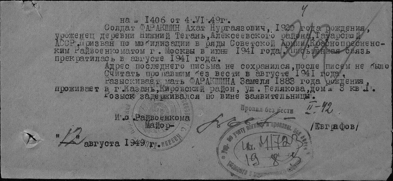 ФАРАКШИН Габделахат Нургаязович, 1919 или 1920, с. Большие Тиганы (либо Нижние Тиганы). Мобилизован Краснопресненским РВК, г. Москва. Красноармеец. Пропал без вести на фронте. Вариант написания фамилии - ФАРУКШИН.