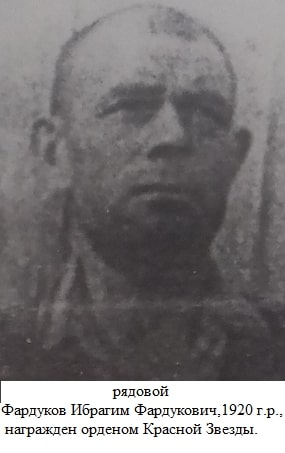 ФАРДУКО́В Ибрагим Фардукович (Иван Фёдорович) (1920, с.Алпарово Спасского у. Казан. губ., ныне Алькеевского р-на РТ — ?), участник Вел. Отеч. войны. В Кр. Армии с октября 1939, призван Алькеевским РВК ТАССР. Воевал с июня 1941 на Калининском, 1-ом и 2-ом Прибалтийском, 1-ом Белорусском фронтах. Гвардии сержант, шофёр батареи 1-го дивизиона 17-й гвардейской миномётной бригады. Был ранен в сентябре 1941, мае 1942, январе и июле 1943. В боях за г.Мюнхеберг весной 1945 быстро и в срок доставлял боеприпасы М-31 на огневые позиции. В р-не завода «Кодак» в пригороде Берлина 19 апреля, когда осколком разорвавшегося снаряда было повреждено электрооборудование машины, Ф. оперативно исправил неполадки и вовремя доставил боеприпасы на передовую. Награждён орденом Красной Звезды (1945).