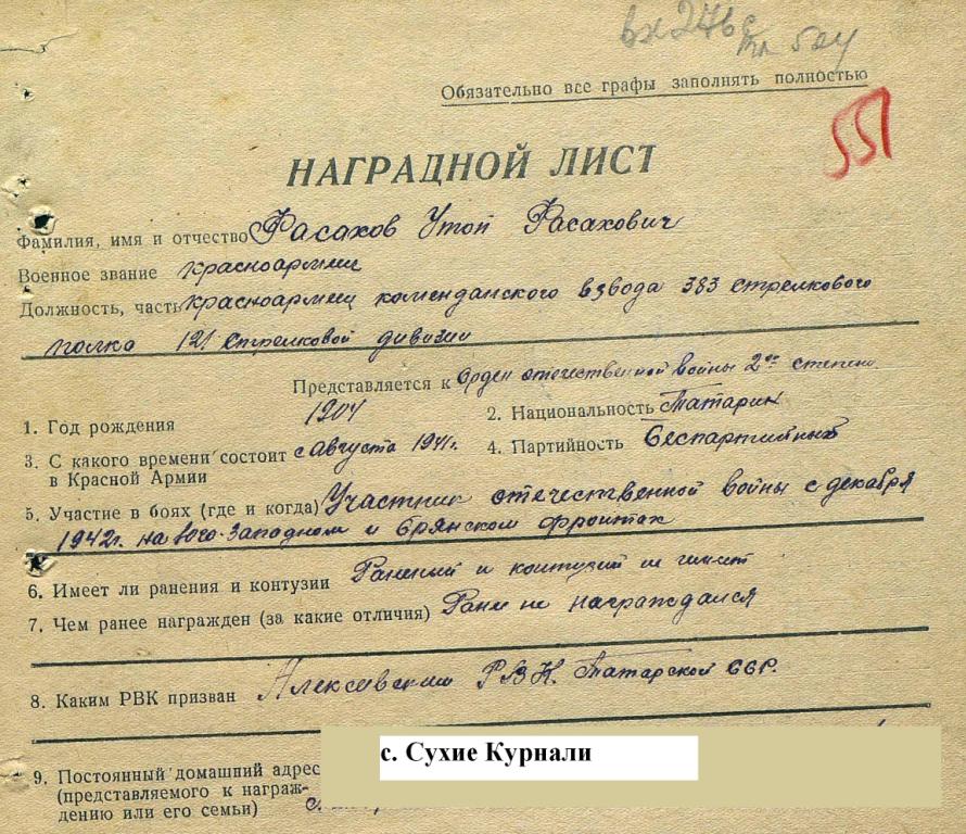 ФАСАХОВ Кутуп Фасахович, 1904, с. Сухие Курнали. Мобилизован в августе 1941 г. Алексеевским РВК. На фронте с декабря 1941 г. (Юго-Западный, Брянский фронт). Красноармеец, стрелок комендантского взвода 383 стр. полка 121 стр. дивизии. В бою 28 июня 1942 г. у с. Петровка Черемисинского района Курской обл. во время налёта вражеской авиации открыл огонь из пулемёта по самолётам противника и сумел зажечь один из них. Самолёт рухнул на нашей территории, его экипаж погиб. В том же бою боец Фасахов огнём пулемёта заставил отступить группу немецких мотоциклистов, пытавшихся зайти во фланг наших подразделений. За этот подвиг был удостоин ордена Отечественной войны 2 ст. В последующих боях был тяжело ранен и демобилизован из армии по инвалидности в 1943 г. По возвращении на родину работал в колхозе "Кызыл Кизляу" бригадиром животноводческой бригады и был награждён медалью "За доблестный труд в Великой Отечественной войне 1941-1945 гг." Скончался в 1972 г., похоронен в с. Сухие Курнали.