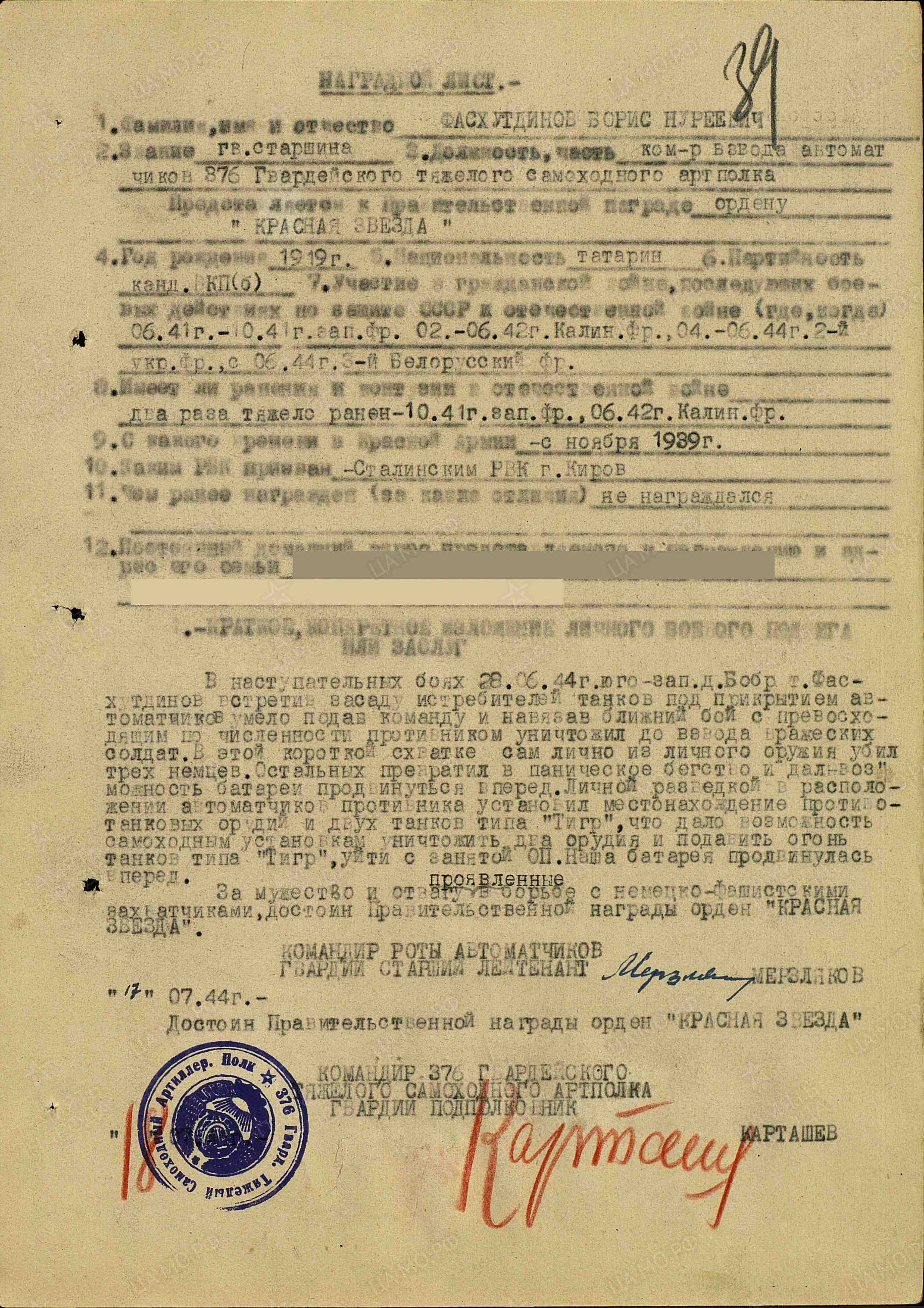 Борис Нуреевич Фасхутдинов родился в 1919 г. в г.Чистополе, ТАССР. В 1939 г. призван в ряды Красной Армии Сталинским районным военным комиссариатом г.Киров. Служил в звании старшины, в должности командира взвода автоматчиков 876 Гвардейского тяжелого самоходного арт.полка. Награжден орденом Красной Звезды (28.07.1944).