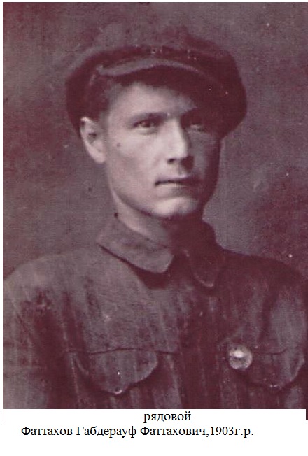Фаттахов Габдерауф Фаттахович родился в 1903 году в с.Каргополь Алькеевского района ТАССР. Фронтовик. Участник Великой Отечественной войны 1941-1945гг. Призван Алькеевским РВК ТатАССР . Погиб в 1943 году. (Фотография и материалы предоставлены Каргопольским сельским поселением)