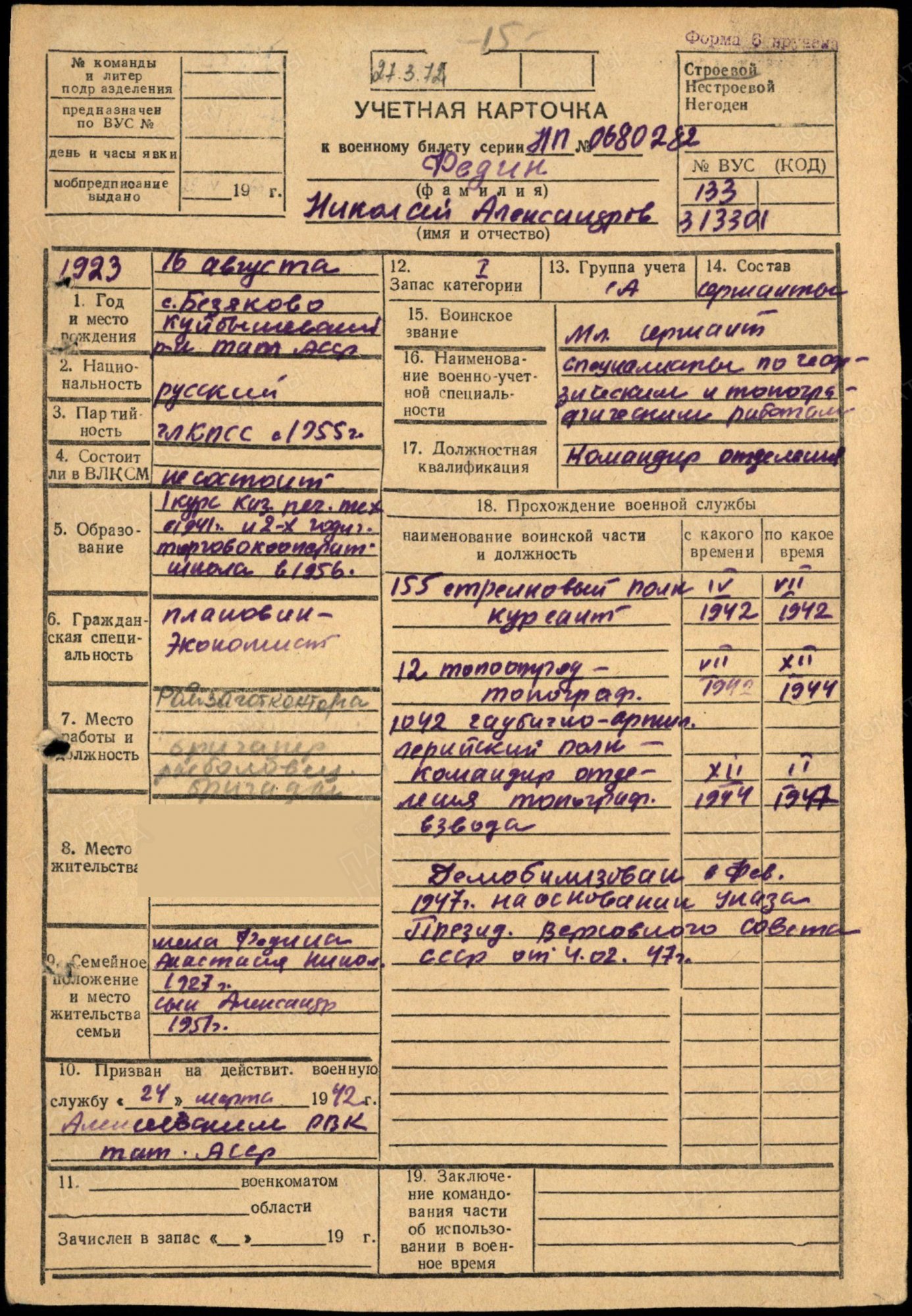 ФЕДИН Николай Александрович, 1923, с. Базяково. Мобилизован 24 марта 1942 Алексеевским РВК. Мл. сержант, 12 топографический отряд, ком. отделения топографического взвода 1042 АП 390 СД 35 А Дальневосточного фронта, 5 СК 2 Дальневосточного фронта. Награждён медалью «За победу над Японией». Демобилизован в 1947.