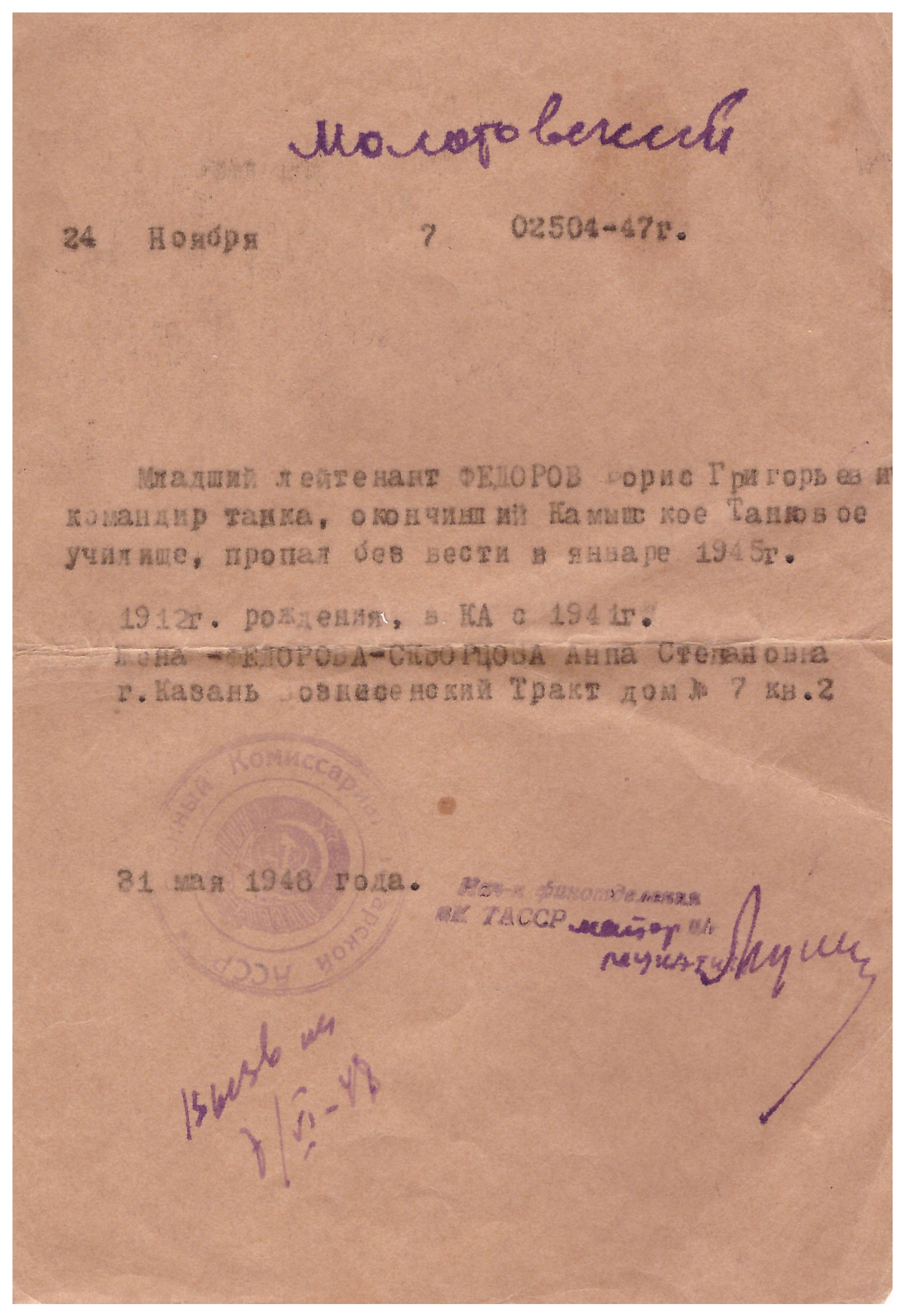 Мой отец, Федоров Борис Григорьевич, 1912 года рождения, младший лейтенант, командир танка, пропал без вести 17 января 1945 года. В Красной Армии служил с 1941 г.