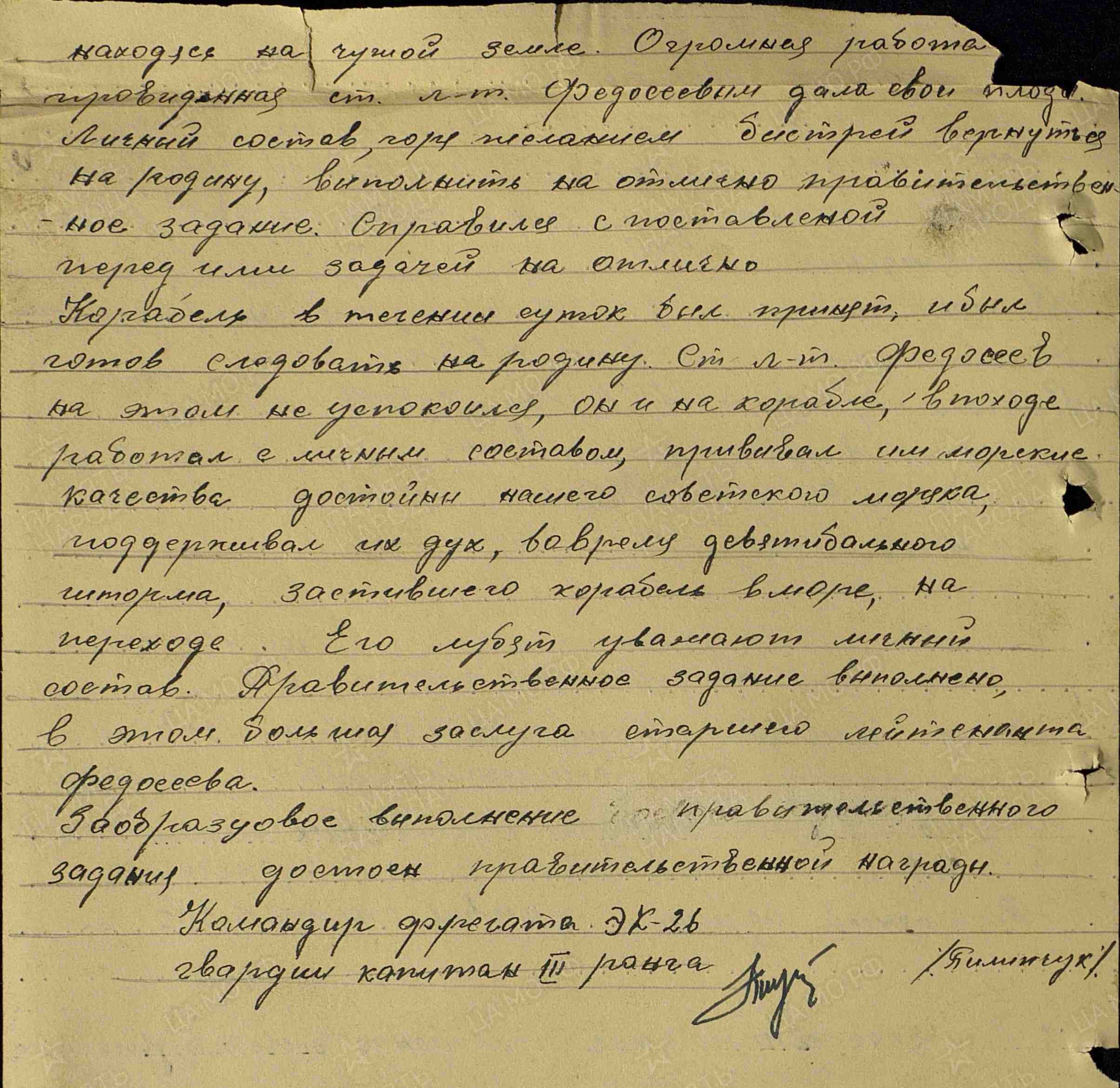 ФЕДОСЕЕВ Михаил Степанович, 1909, с. Остолопово. В армии с 1931. Член ВКП(б) с 1939. В 1941 направлен на военно-морской флот. Ст. лейтенант, зам. ком. корабля по политической части, тральщик № 94 охраны водного района Тихоокеанского флота, фрегат «ЭК-26». Участвовал в переброске военных кораблей из США, в Советско-японской войне. Награждён медалями «За боевые заслуги» (1946), «За победу над Японией», орденом Красной Звезды. Демобилизован в 1947.
