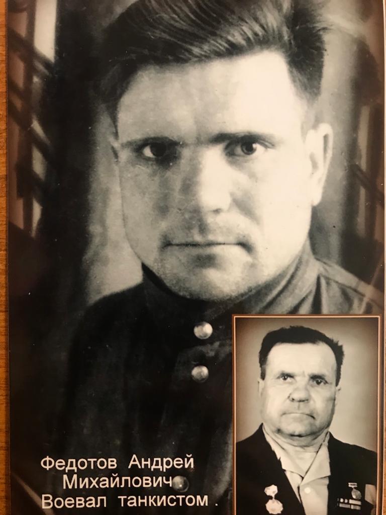 Федотов Андрей Михайлович был призван в армию 15 сентября 1941 В начале войны воевал в 74 лыжном батальоне на Калининском фронте, был ранен. С января 1942 года был на лечении в госпитале № 4068 Горьковской области. После госпиталя был направлен в 31 танковый батальон г. Киров. С августа 1942 по апреля 1943 года воевал там. С апреля 1943 года был направлен в научно - испытательный бронетанковый полигон, механиком - водителем танка. Там он продолжал свою службу по декабрь 1947 года.