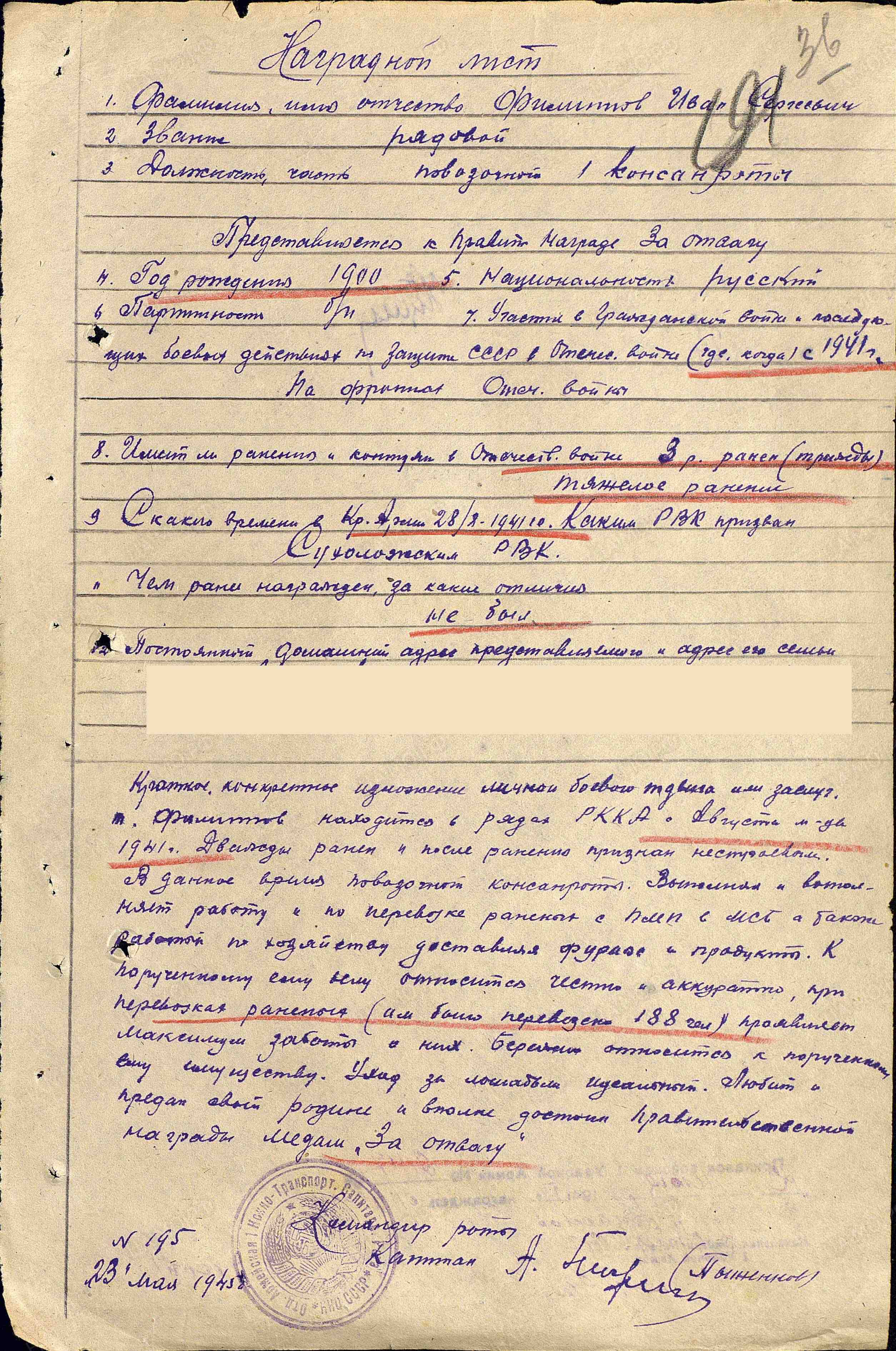 Иван Сергеевич Филиппов родился в 1900 г. в г.Чистополе, ТАССР. В 1941 г. призван в ряды Красной Армии Сухоложским районным военным комиссариатом. Служил в должности повозочного 1 кон.сан.роты. В боях был трижды ранен. Награжден орденом Красной Звезды (02.06.1945).