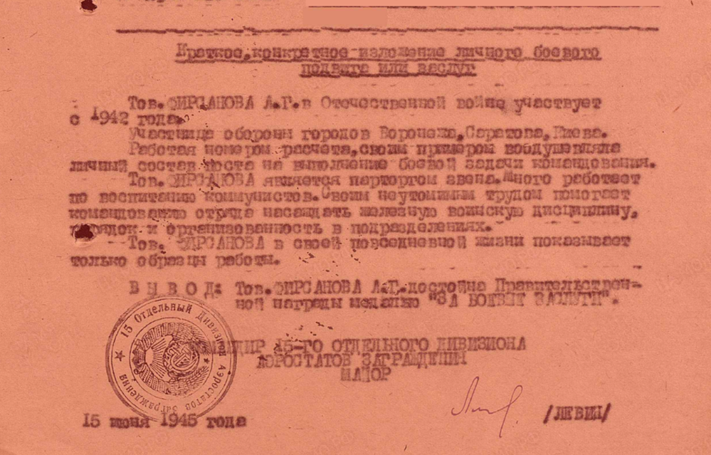 Фирсанова Александра Георгиевна родилась в 1920 году. Место рождения: Татарская АССР, Чистопольский р-н, с. Изгари. Звание: ефрейтор. В РККА с 06.1942 года. Место призыва: Ново-Шешминский РВК, Татарская АССР, Ново-Шешминский р-н. Место службы: 15 одн АЗ 12 корп. ПВО. Награждена 03.07.1945 года медалью «За боевые заслуги».